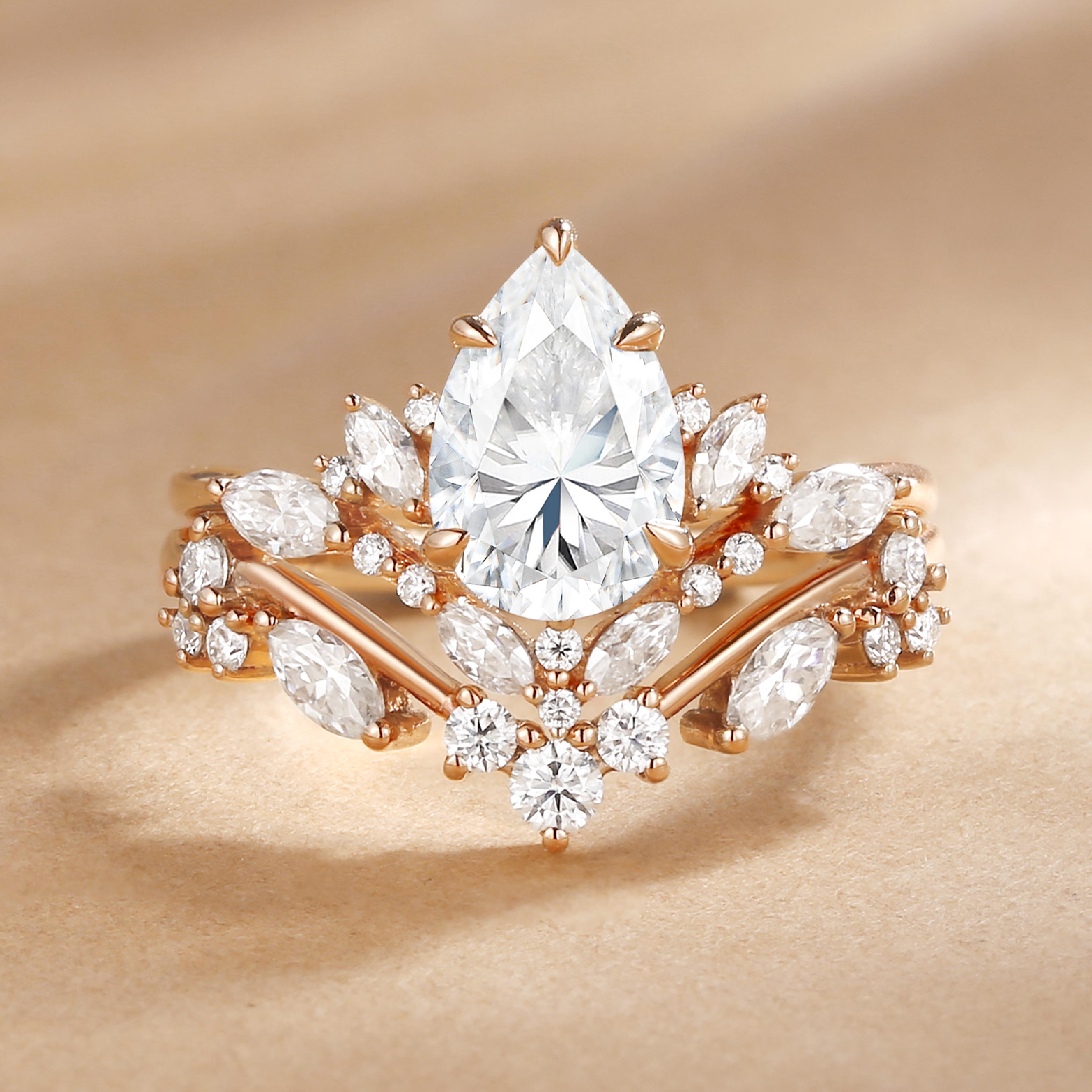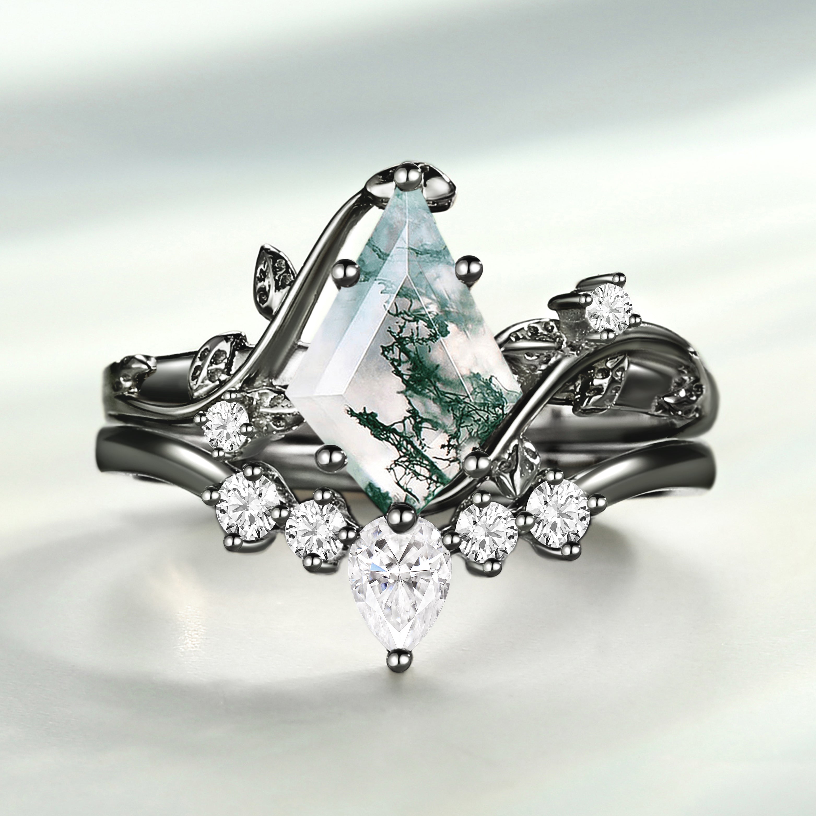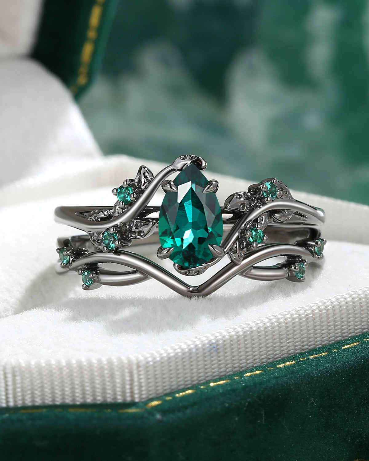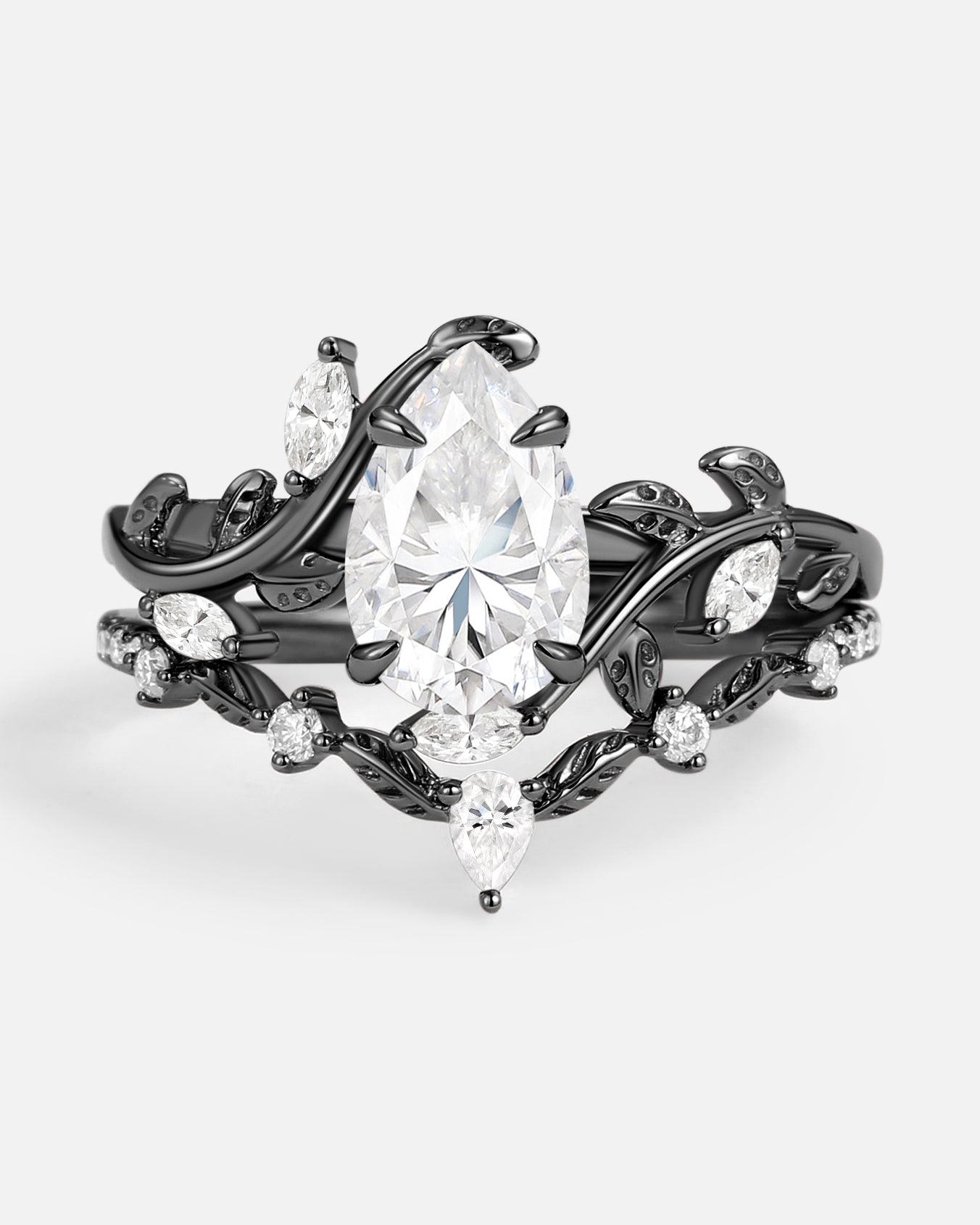 Pear Cut Leafy Salt and Pepper Diamonds Engagement Ring Sets 2pcs - Pyrrhus