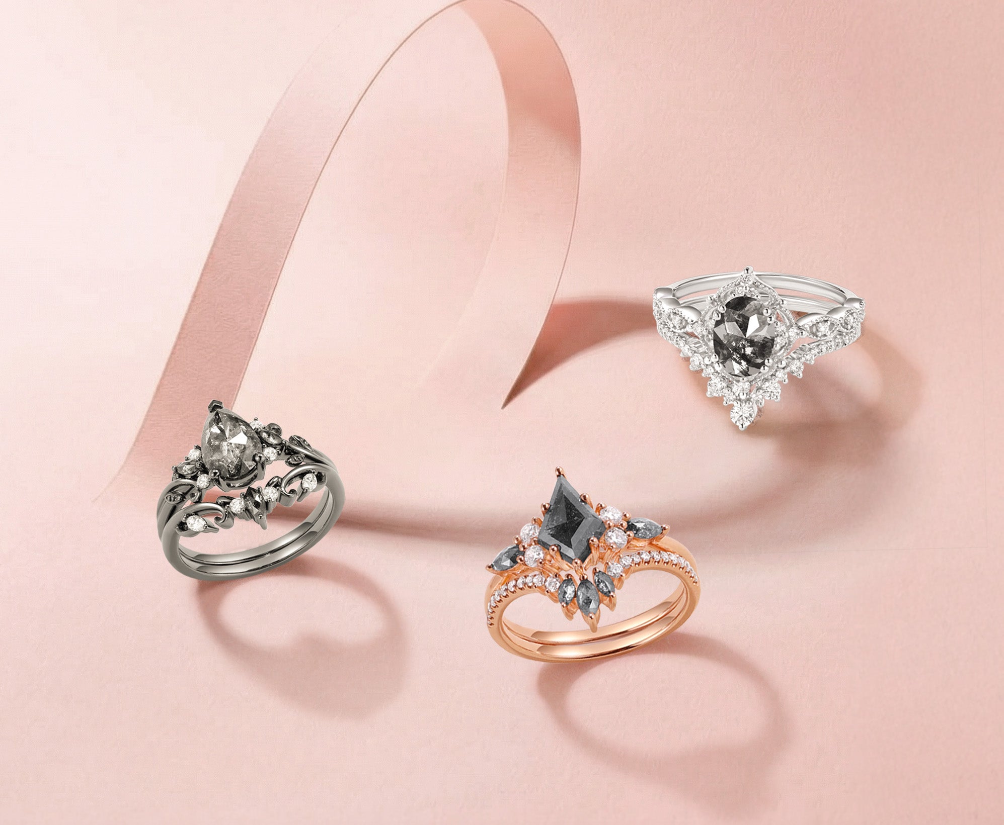 Twin Flames - Kite Salt and Pepper Diamonds Engagement Ring Set 2pcs - Zendaya