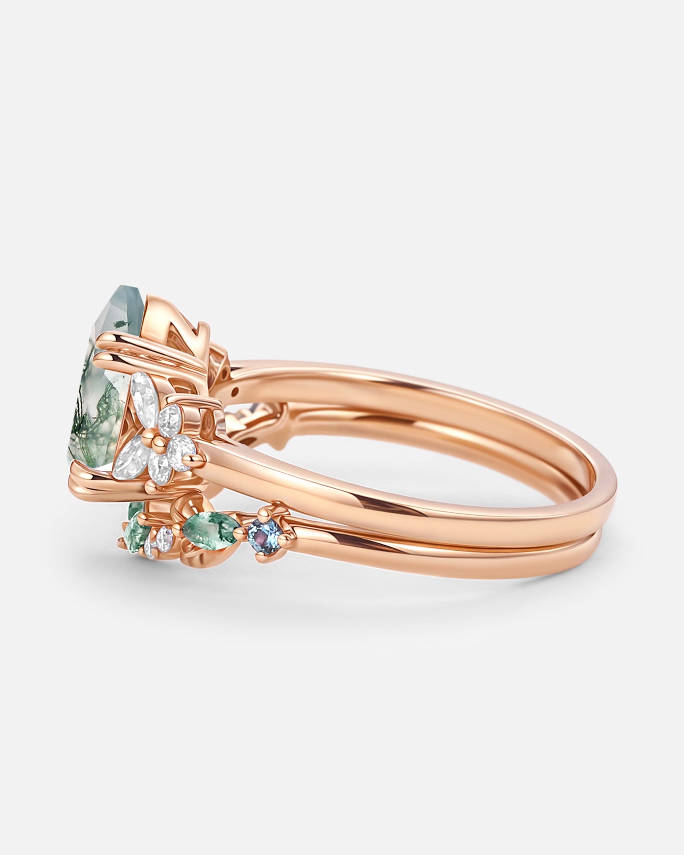 Spring green, summer transparency, autumn yellow, winter milky haze—our moss agate fits each season’s hue. These precious chapters in the ring tell your story daily.