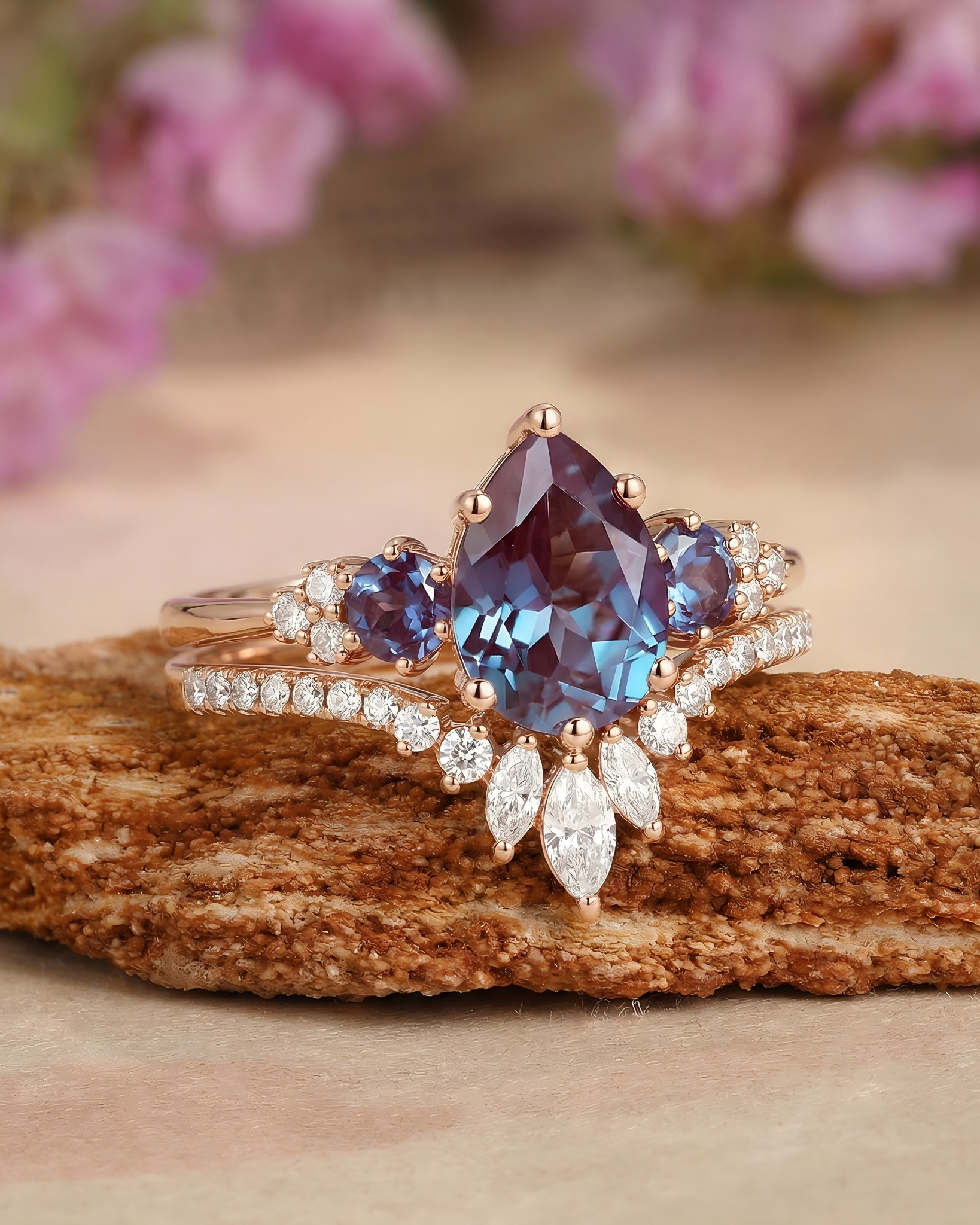 Unique Opal & Alexandrite & Emerald Three Leaves Engagement Ring Set 2pcs - Mermaid