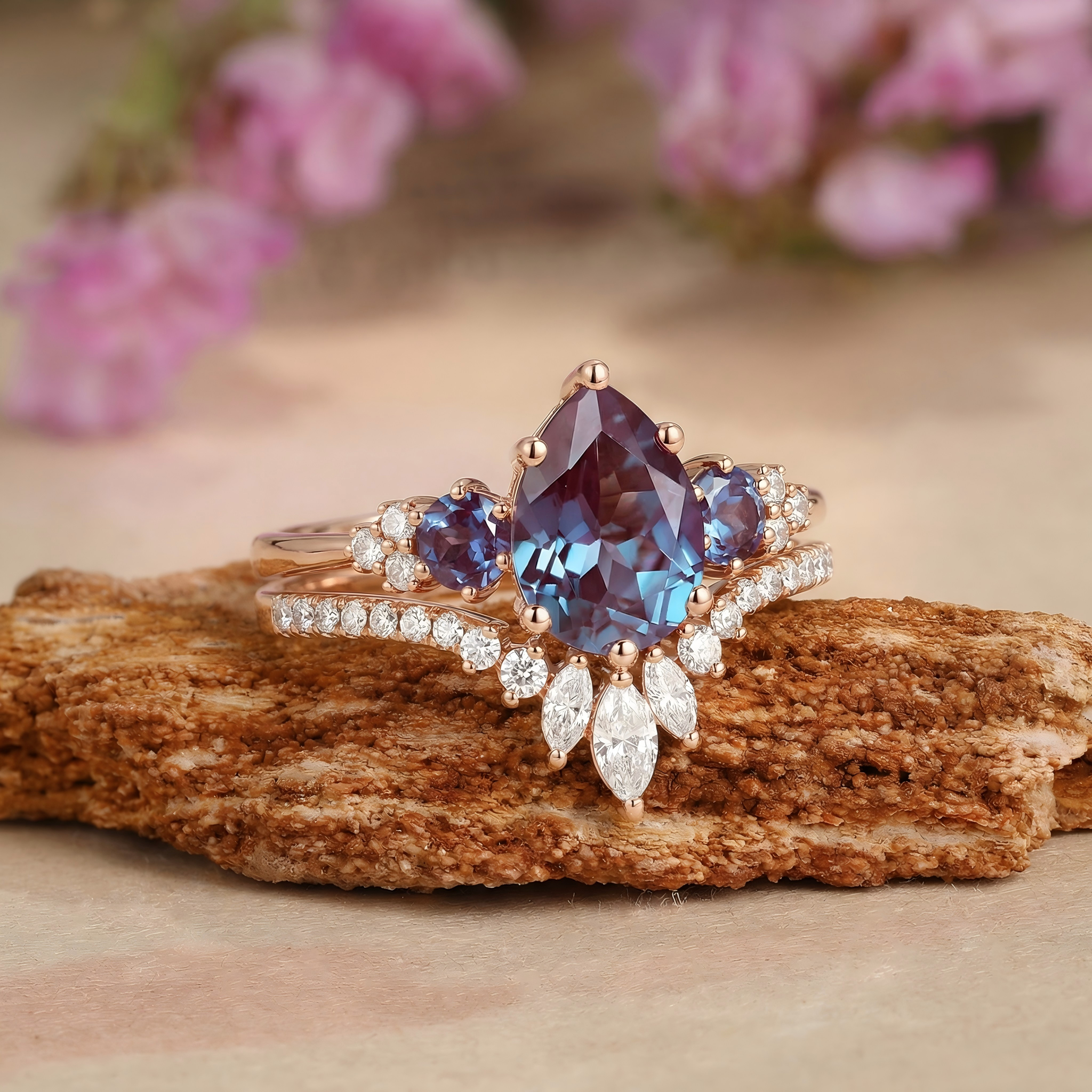 Unique Opal & Alexandrite & Emerald Three Leaves Engagement Ring Set 2pcs - Mermaid