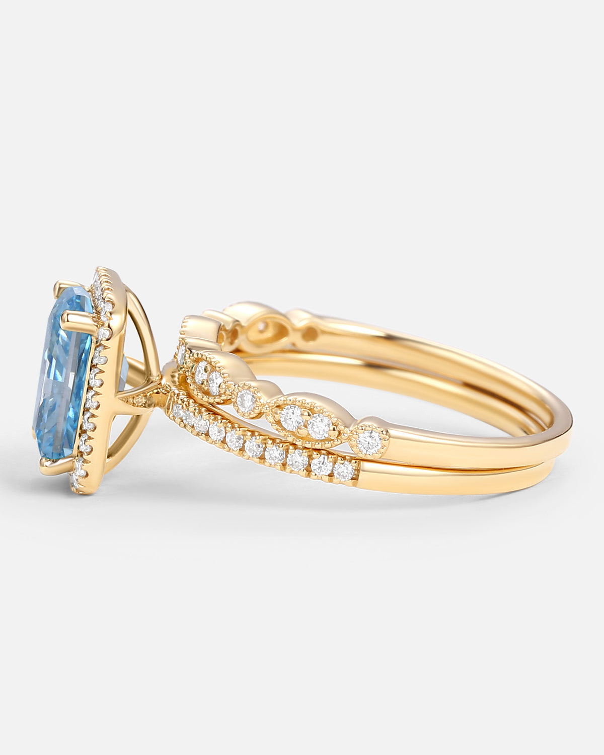 Unique Kite Cut Teal Sapphire Leafy Bridal Ring Sets 2pcs - Willow