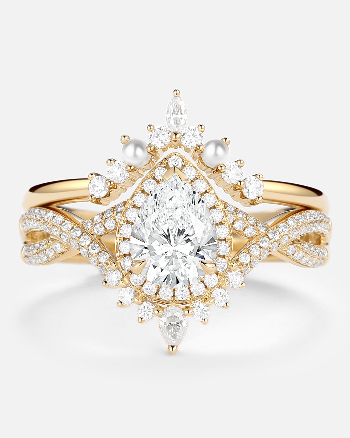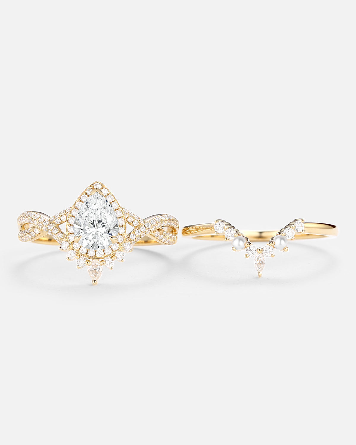 Pear Shaped Lab Grown Diamond & Pearl Halo Infinity Gold Ring Set 2pcs