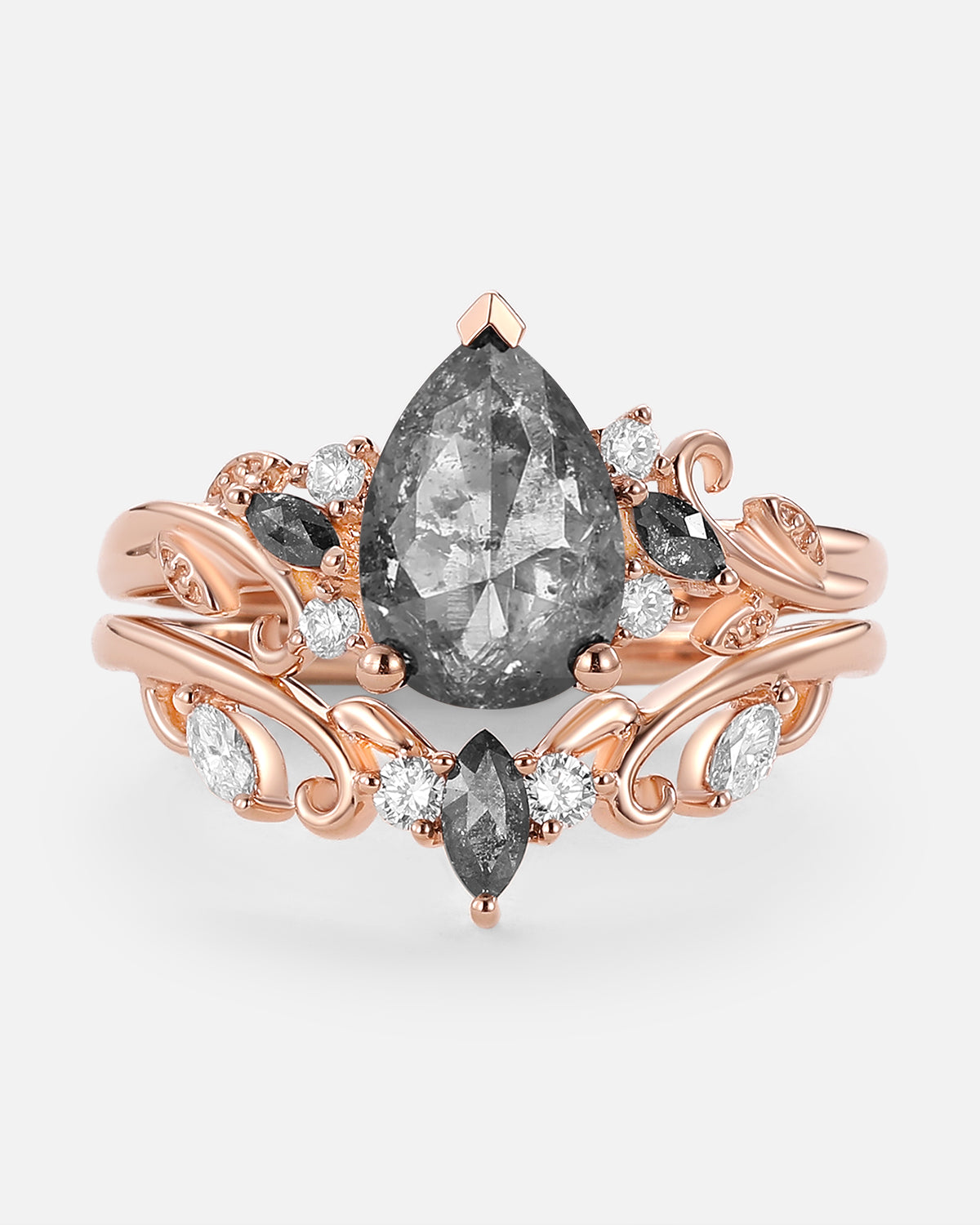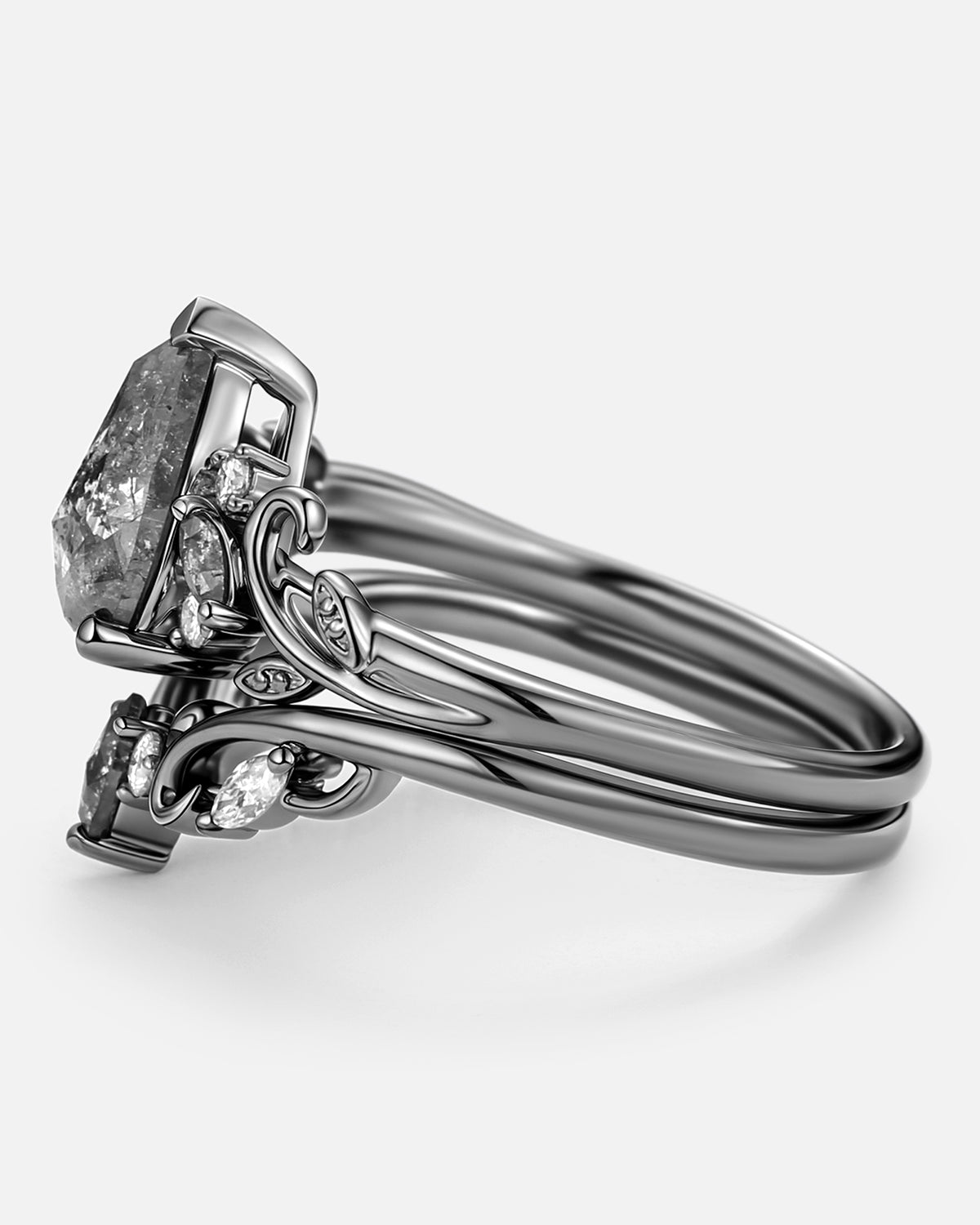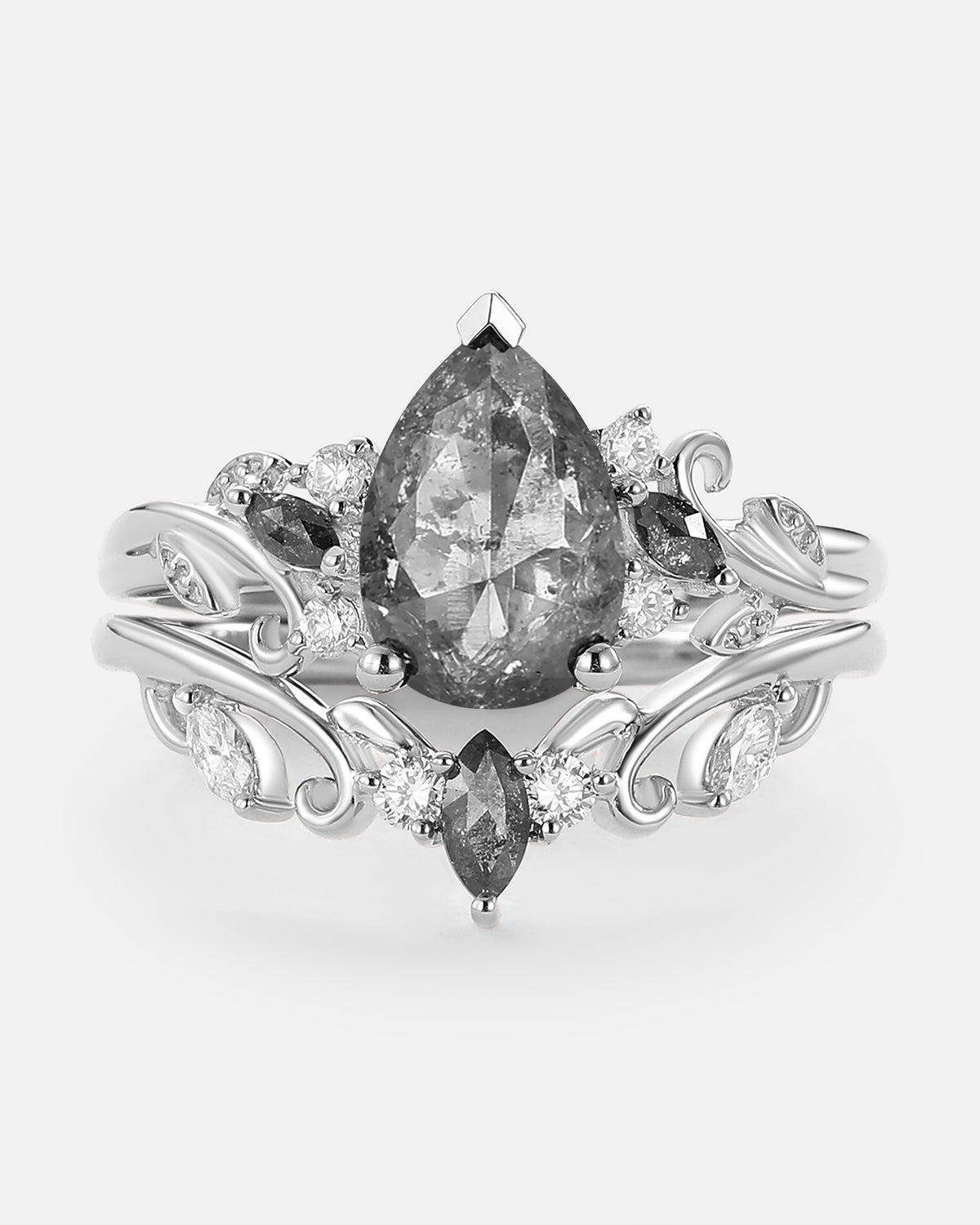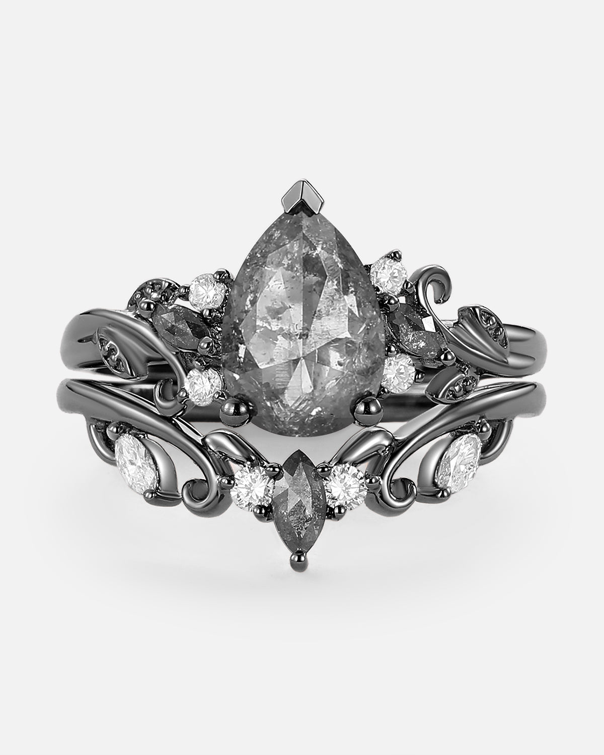 Pear Cut Leafy Salt and Pepper Diamonds Engagement Ring Sets 2pcs - Pyrrhus
