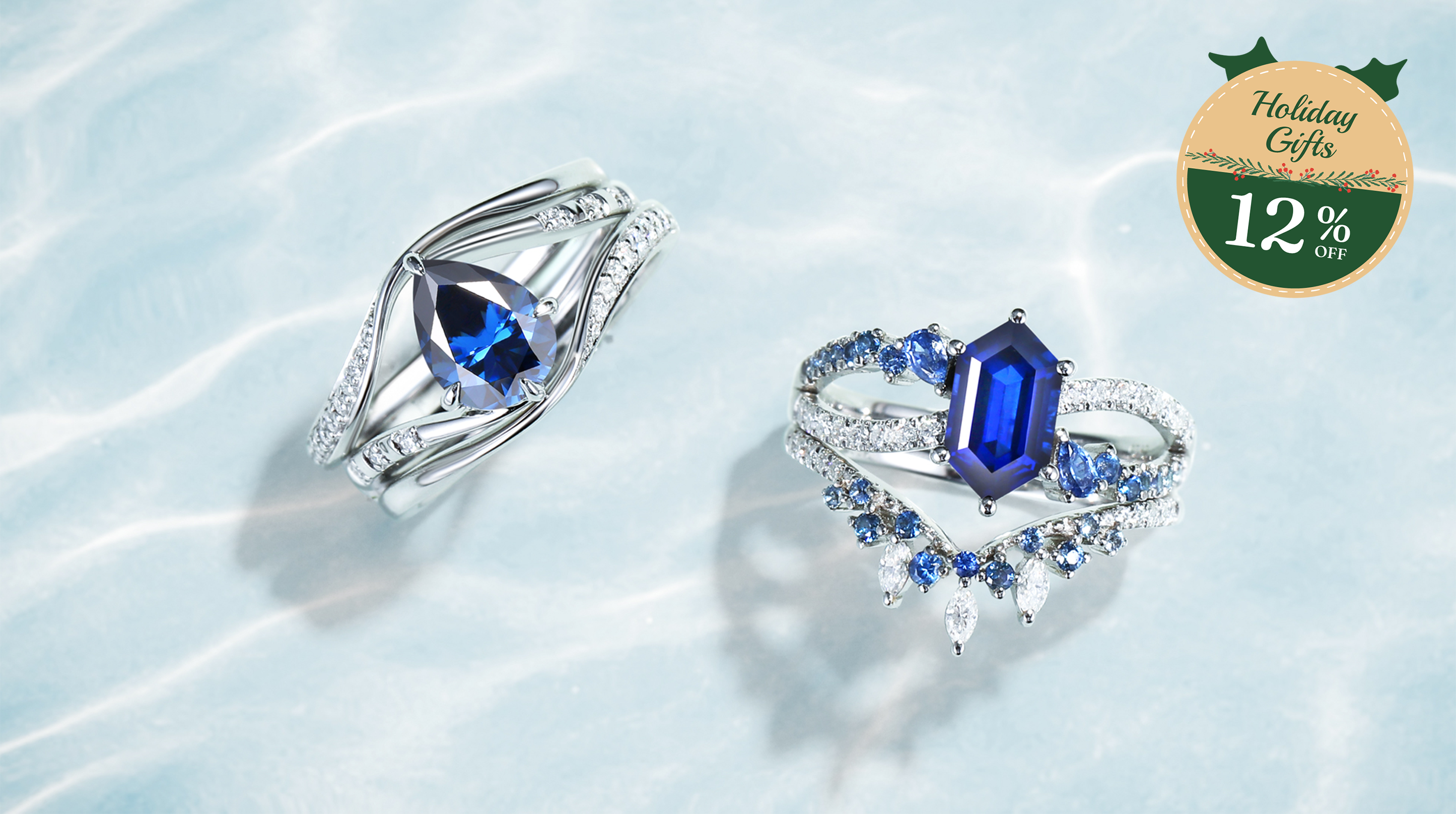 Long Hexagon Lab Sapphire Engagement Ring Set 2pcs - Cerulex