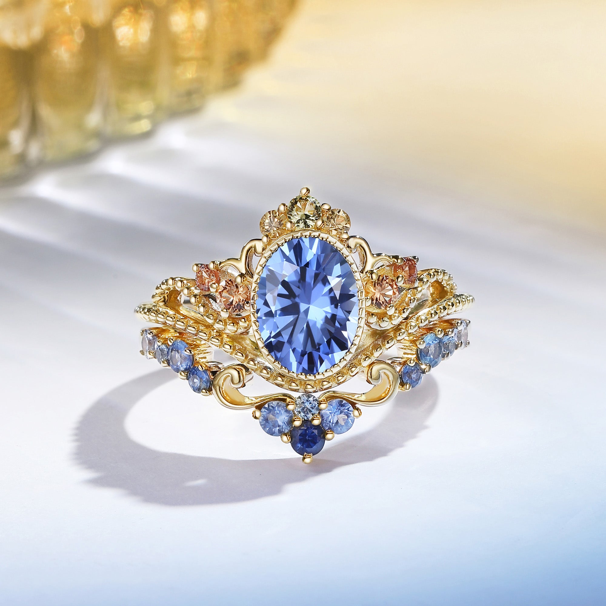 Dusk Sea Whisper - Lab Cornflower Sapphire Oval Cut Vintage Ring Set 2pcs