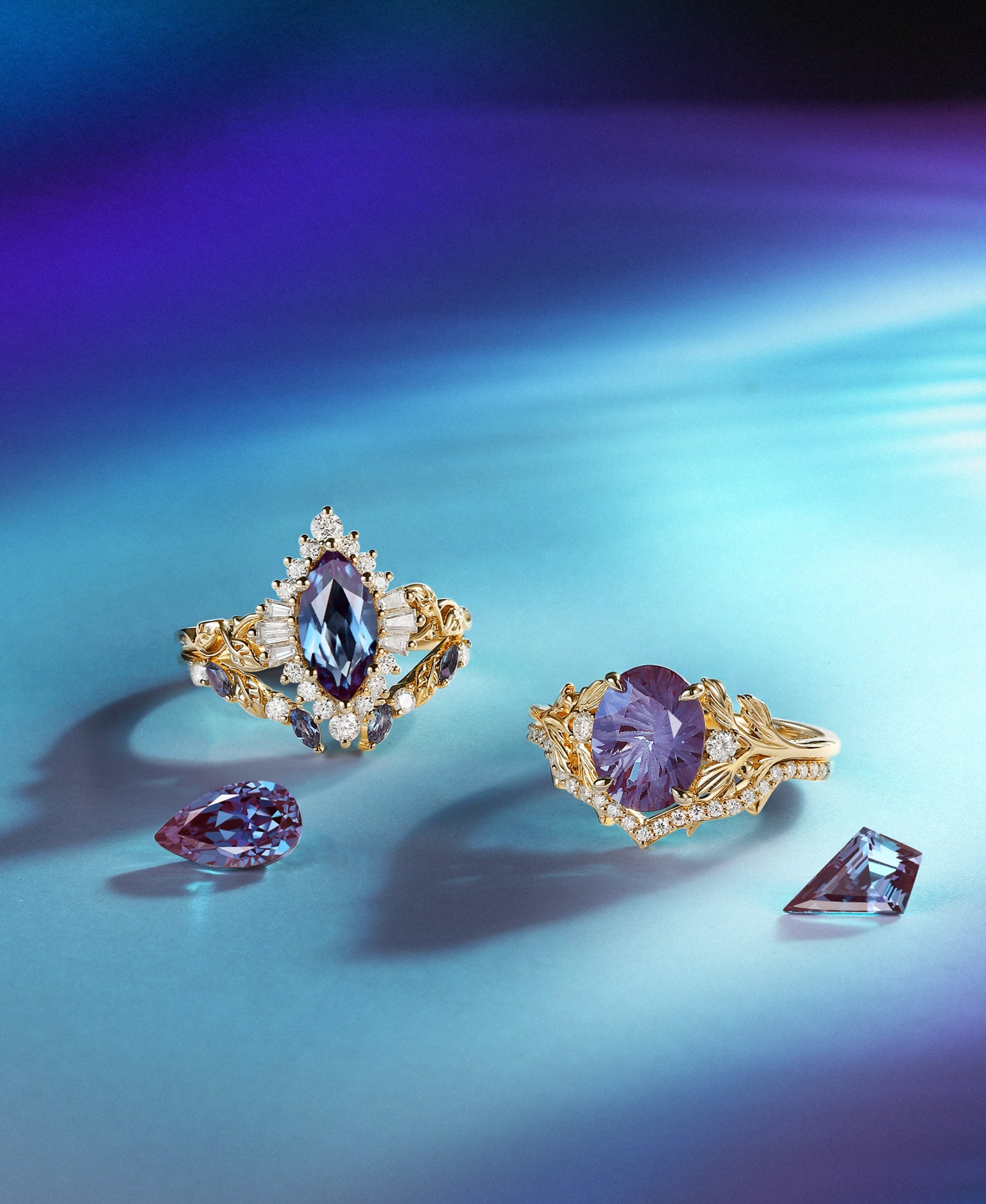 Unique Opal & Alexandrite & Emerald Three Leaves Engagement Ring Set 2pcs - Mermaid