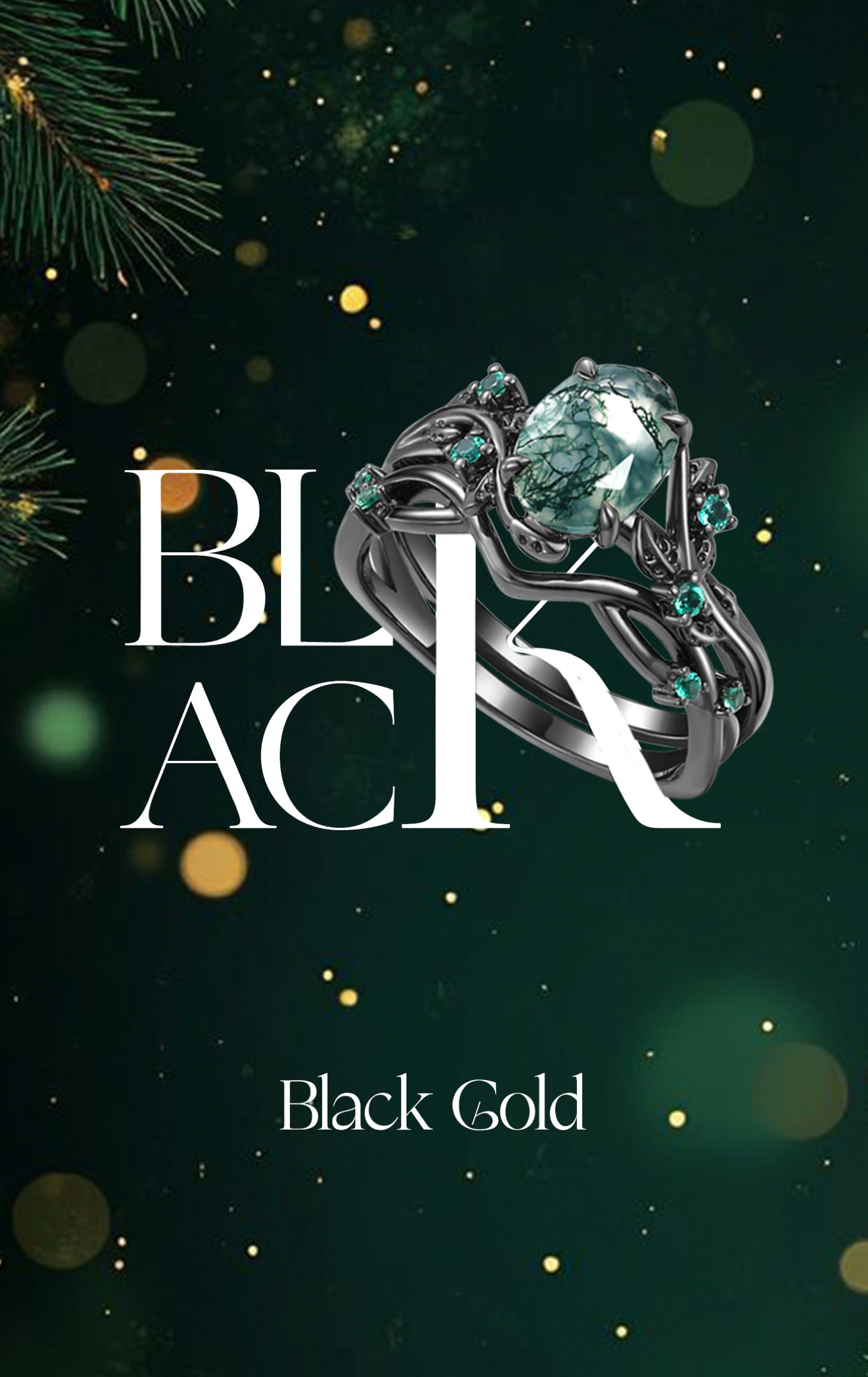 Nature Inspired - Oval Cut Moss Agate Leafy Black Gold Couple Ring Set 3pcs - Mossy