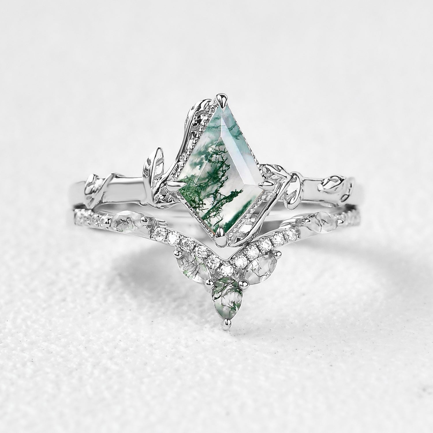 Unique Kite Cut Moss Agate Leafy Bridal Ring Sets 2pcs - Willow