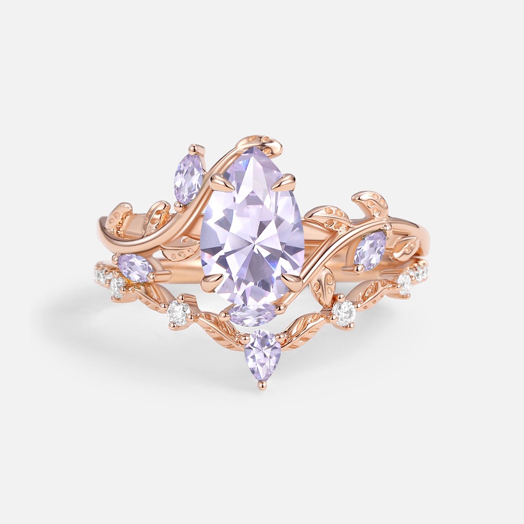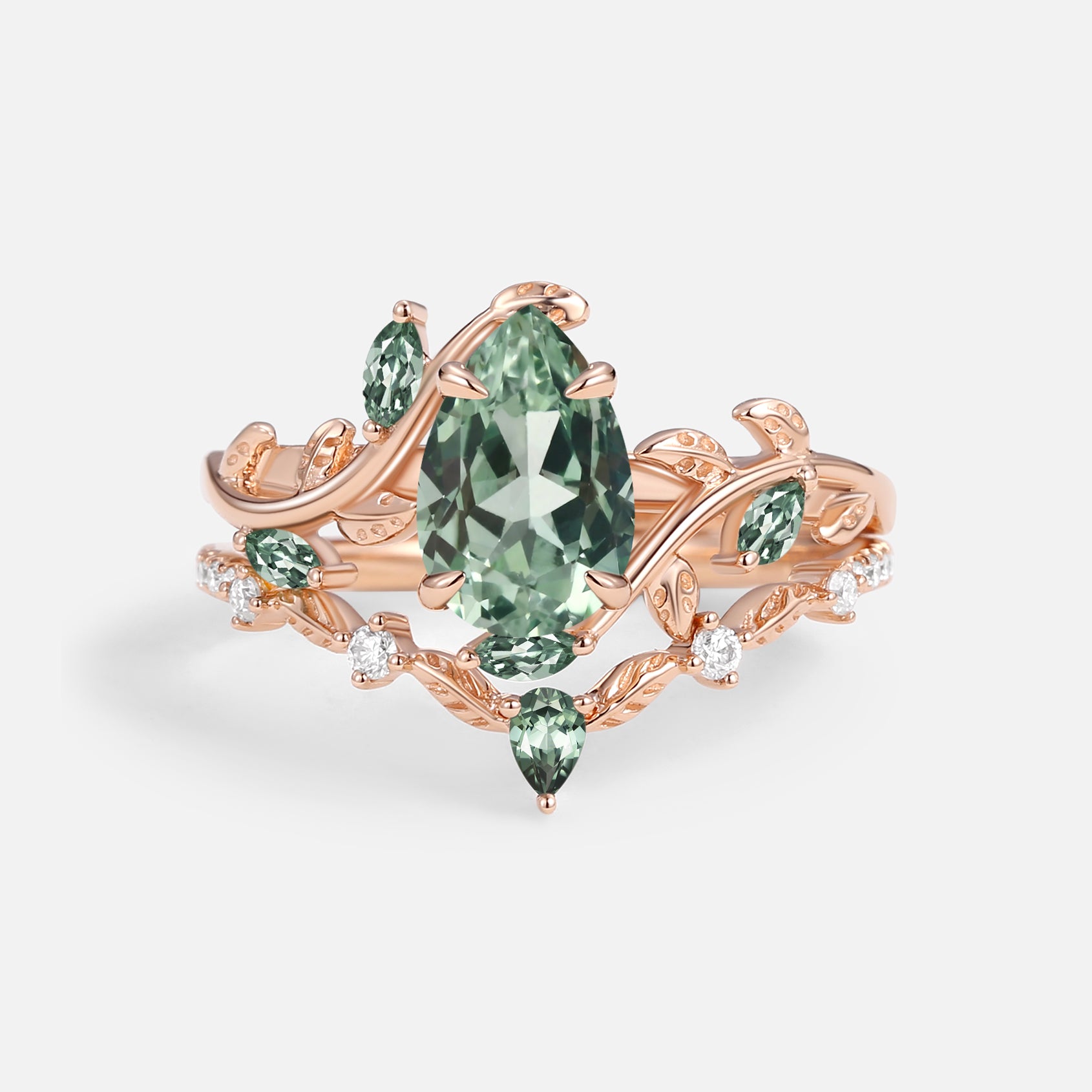 Green Moss Agate Pear Vine Engagement Ring Set 2pcs - Daphne
