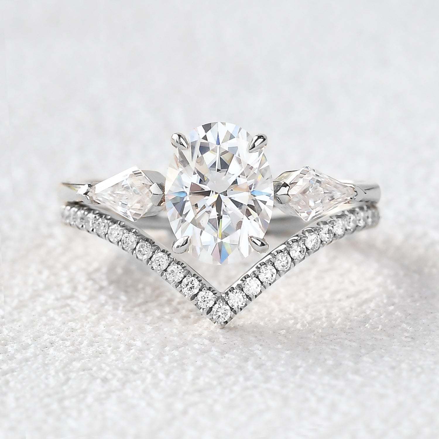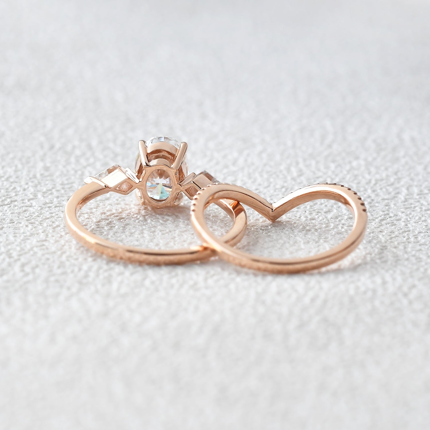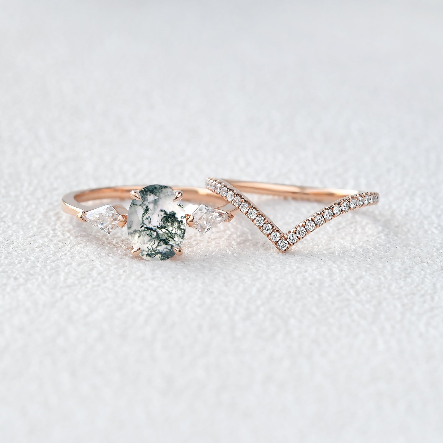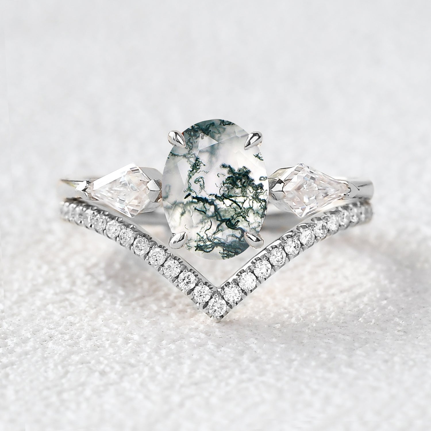 1.5ct Oval Moss Agate Three Stones Chevron Engagement Ring Set 2pcs