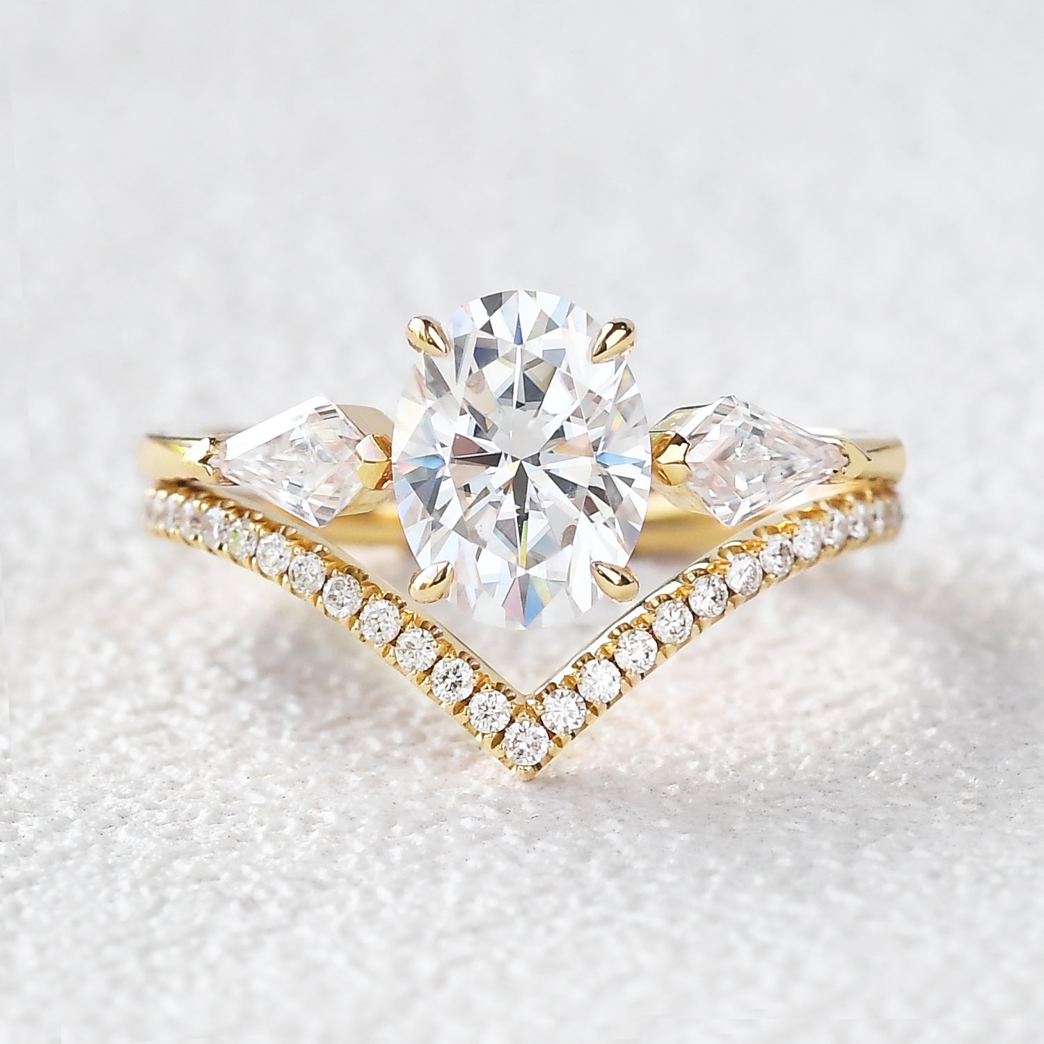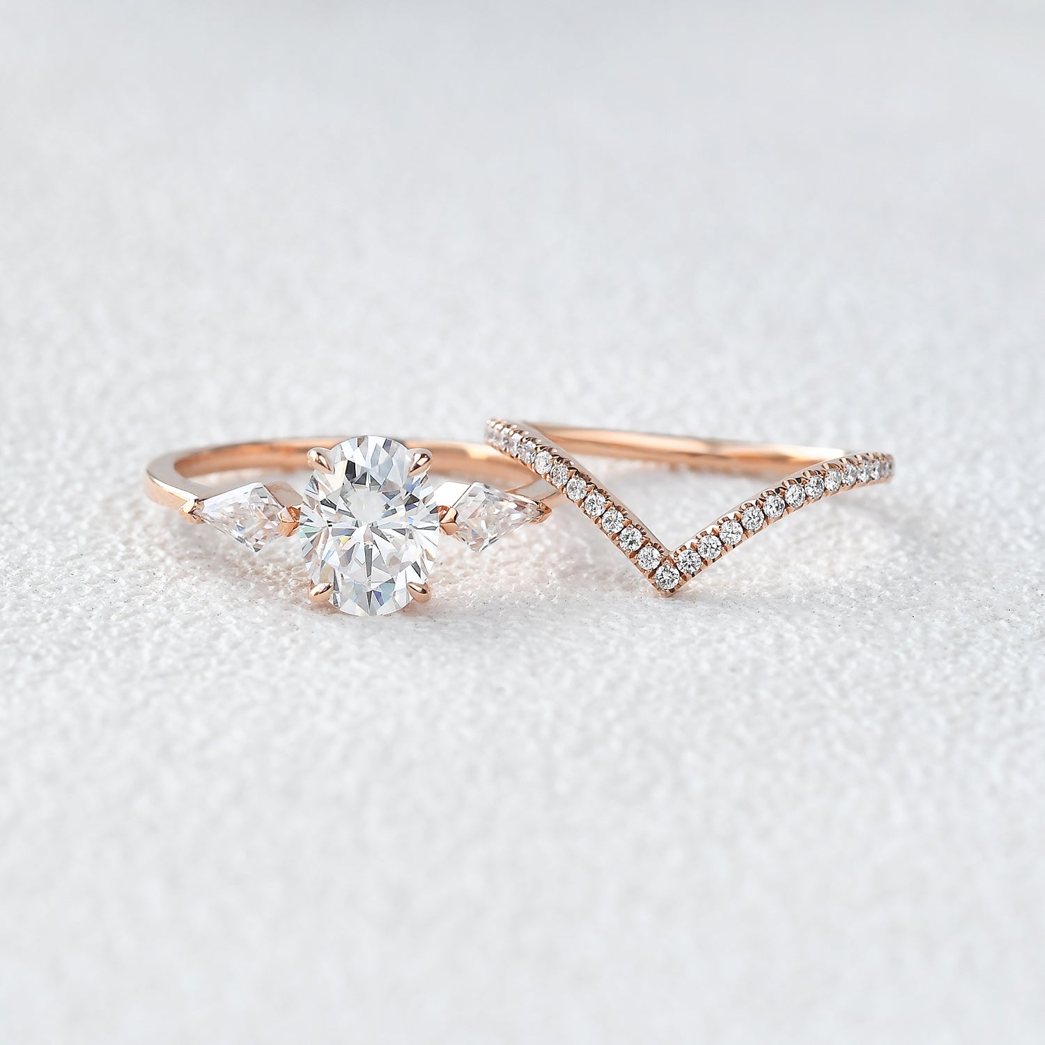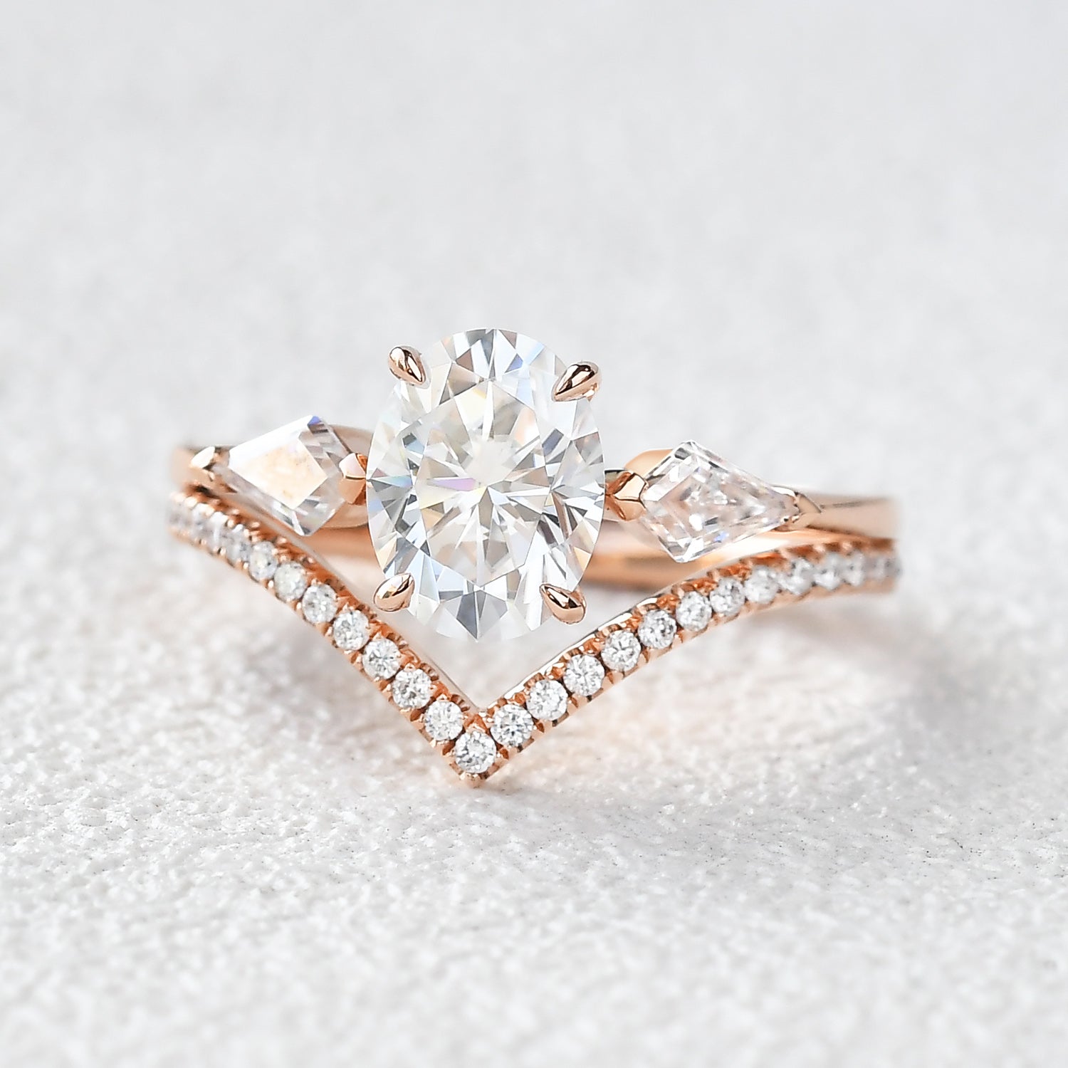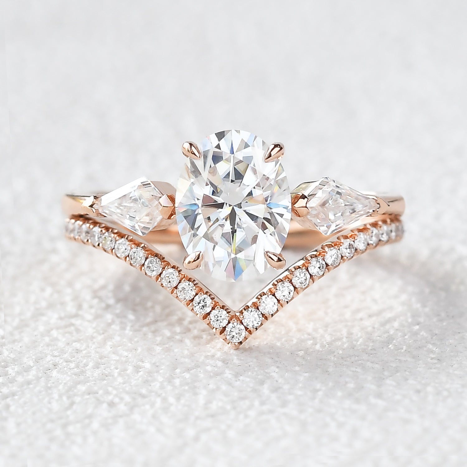 1.5ct Oval Moss Agate Three Stones Chevron Engagement Ring Set 2pcs