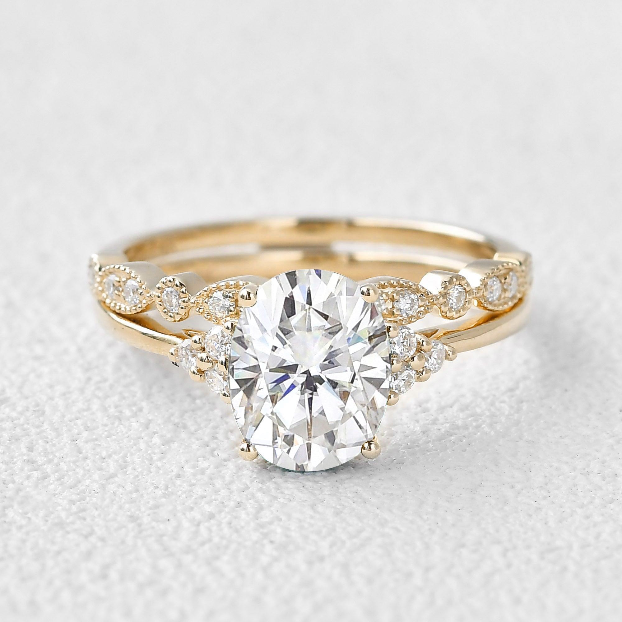 Felicegals 2.0ct Oval Cut Moissanite Vintage Cluster Ring Set 2pcs Engagement Ring Vintage Inspired Art-Deco Wedding Ring Anniversary Gift