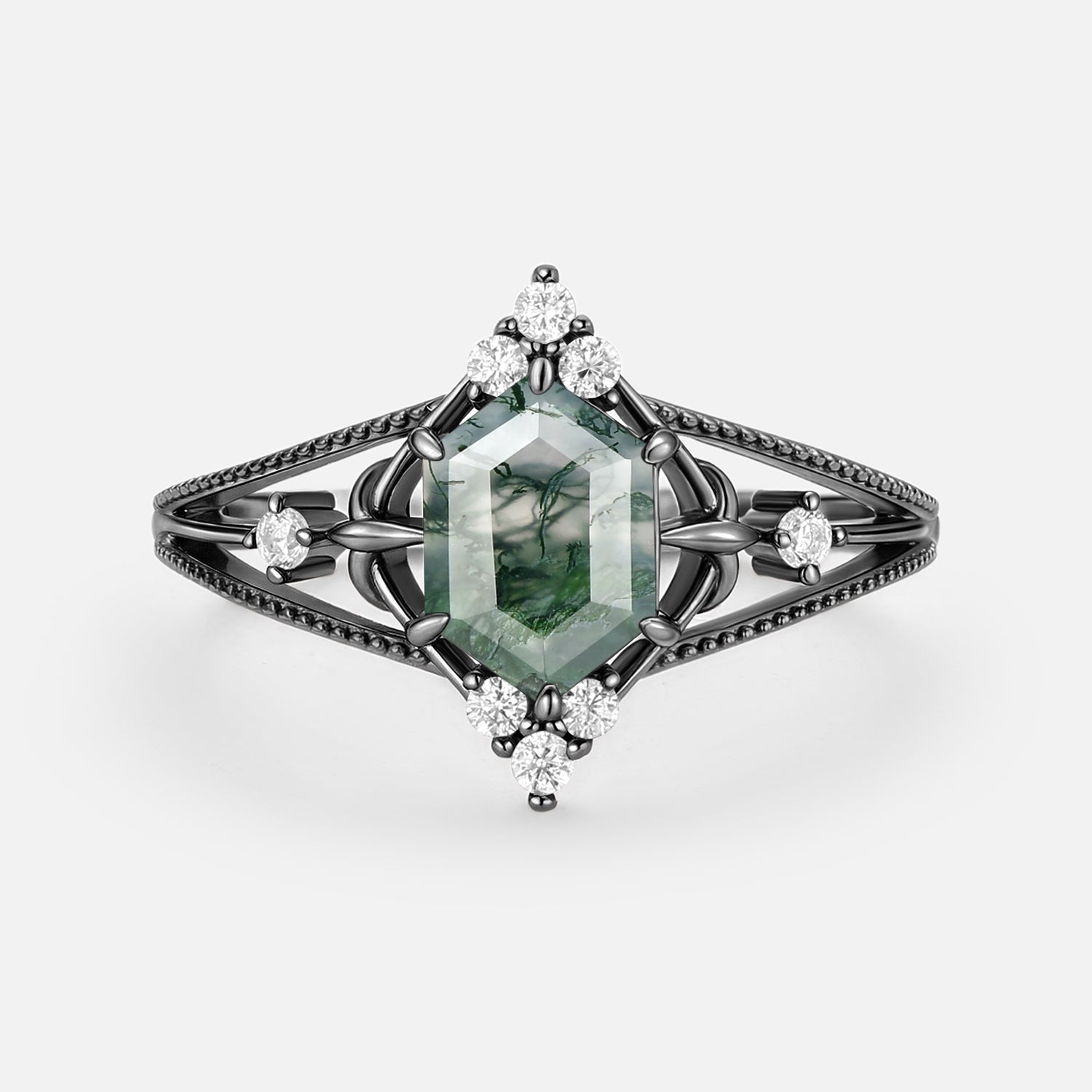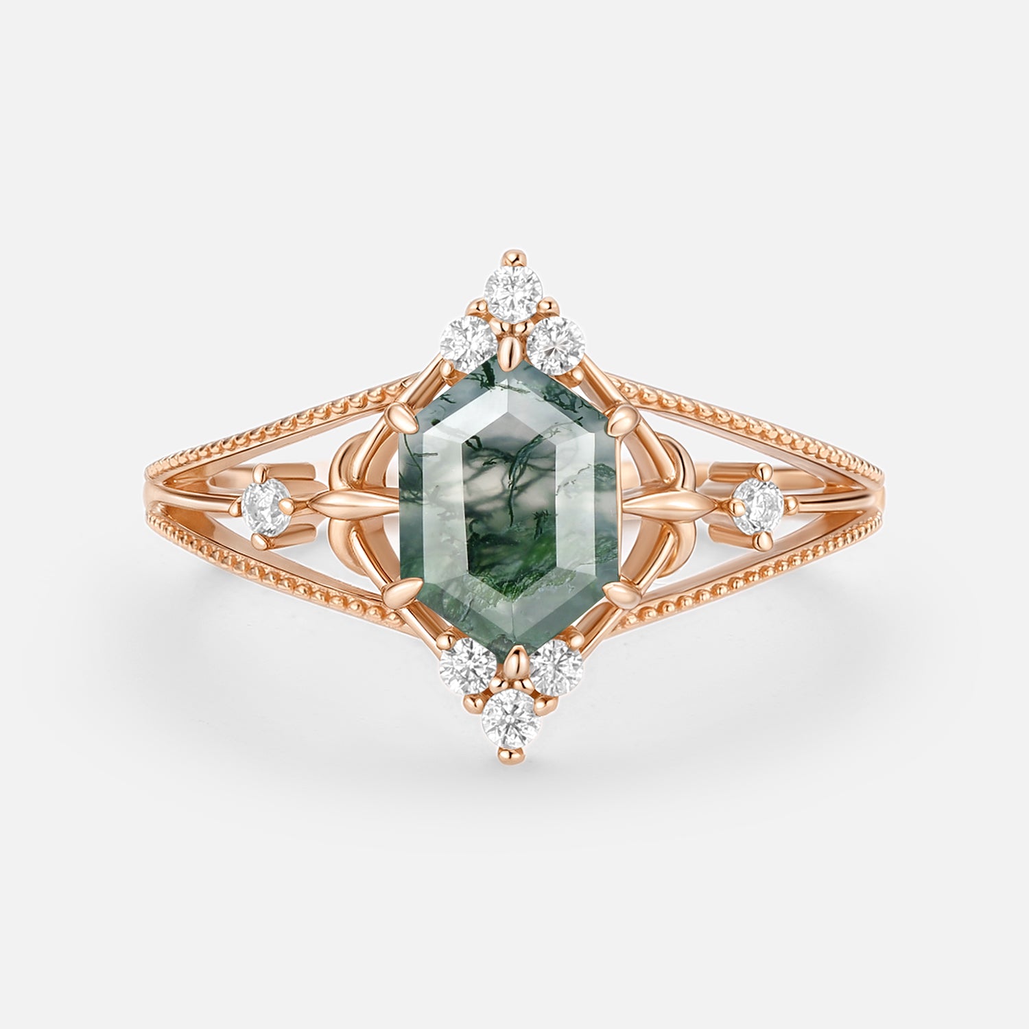 Hexagon Moss Agate Leafy Moissanite Engagement Ring - Erebus