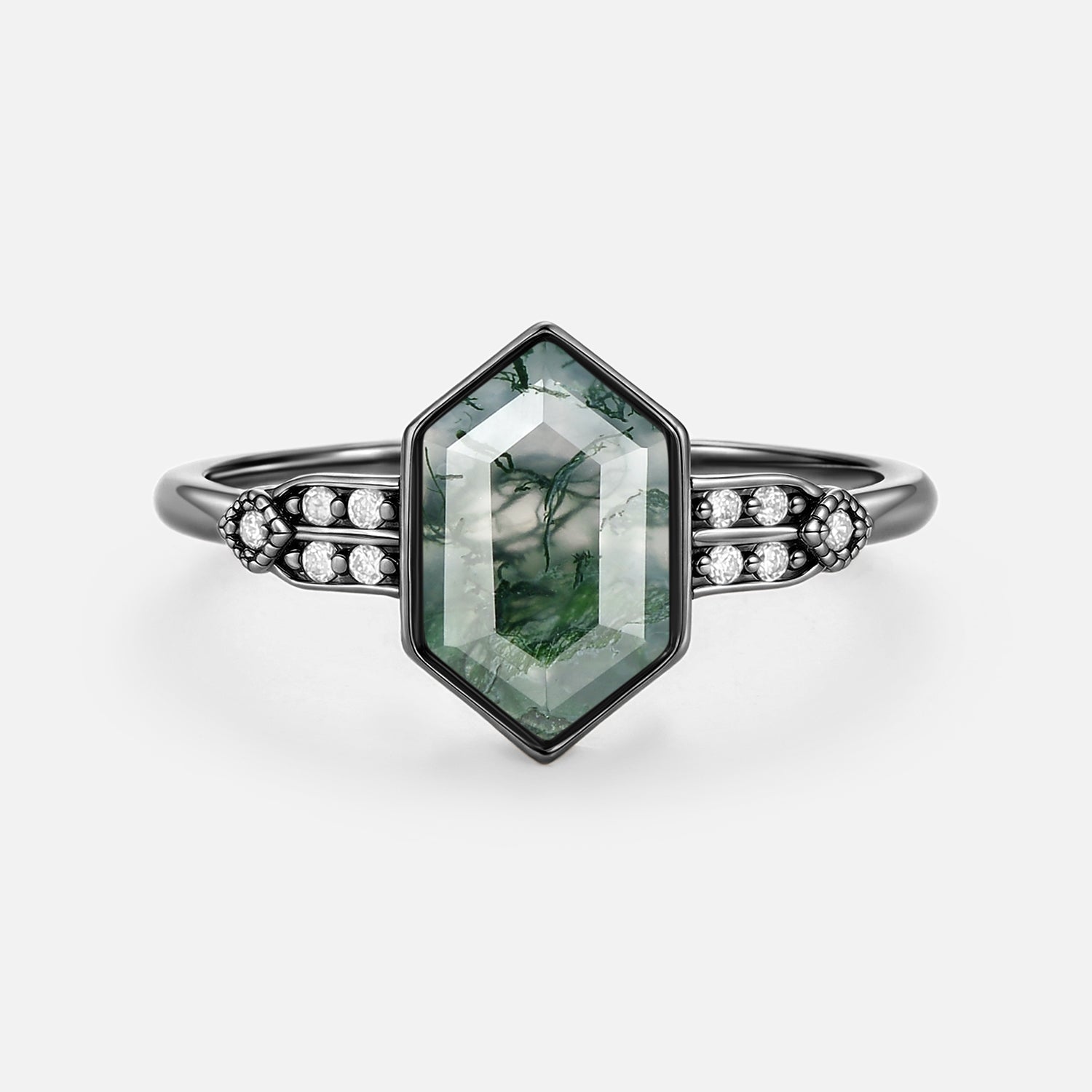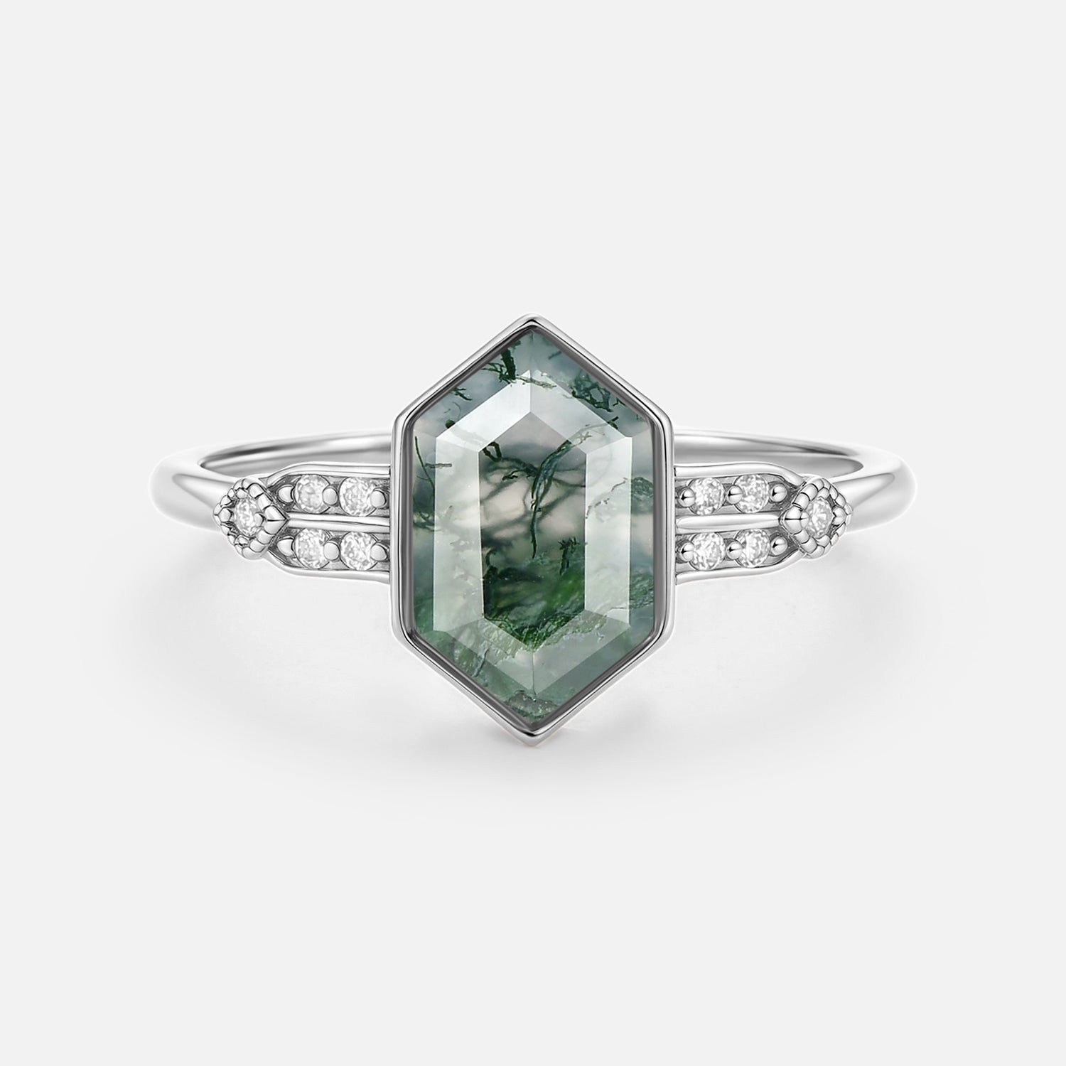 Hexagon Moss Agate Leafy Moissanite Vintage Engagement Ring - Nocturne