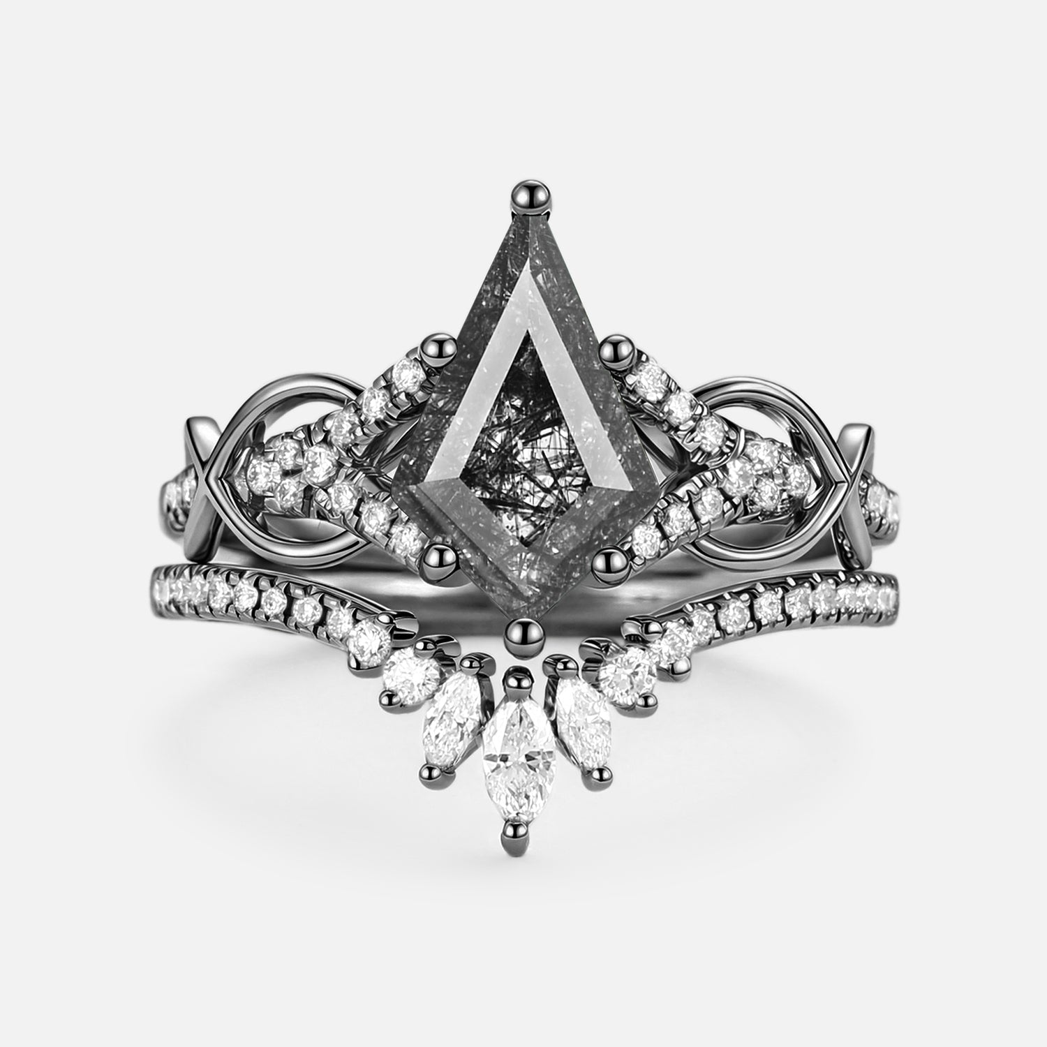 Kite Cut Black Rutilated Quartz Infinity Antique Engagement Ring Set 2pcs