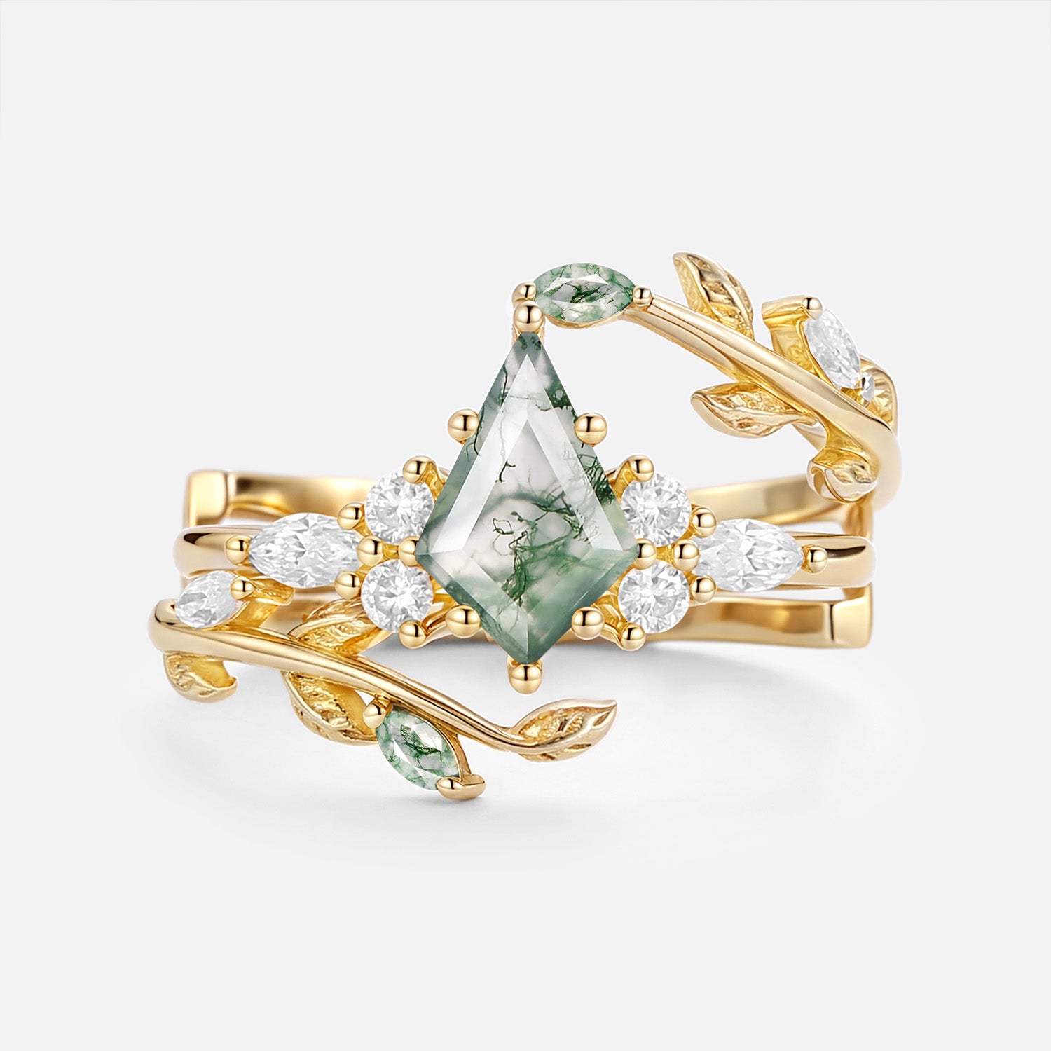 Kite Cut Moss Agate Leafy Cage Engagement Ring Set 2pcs - Vern