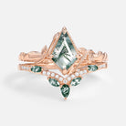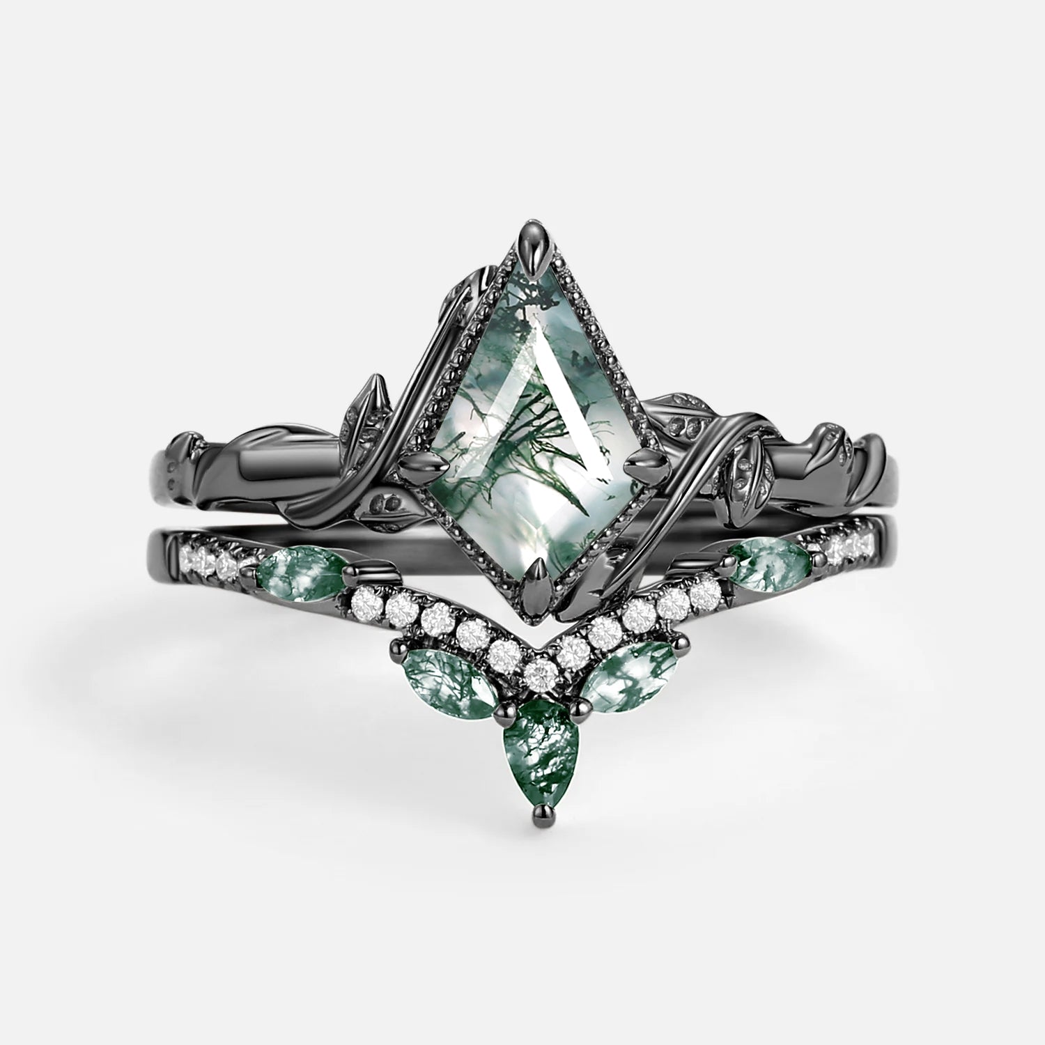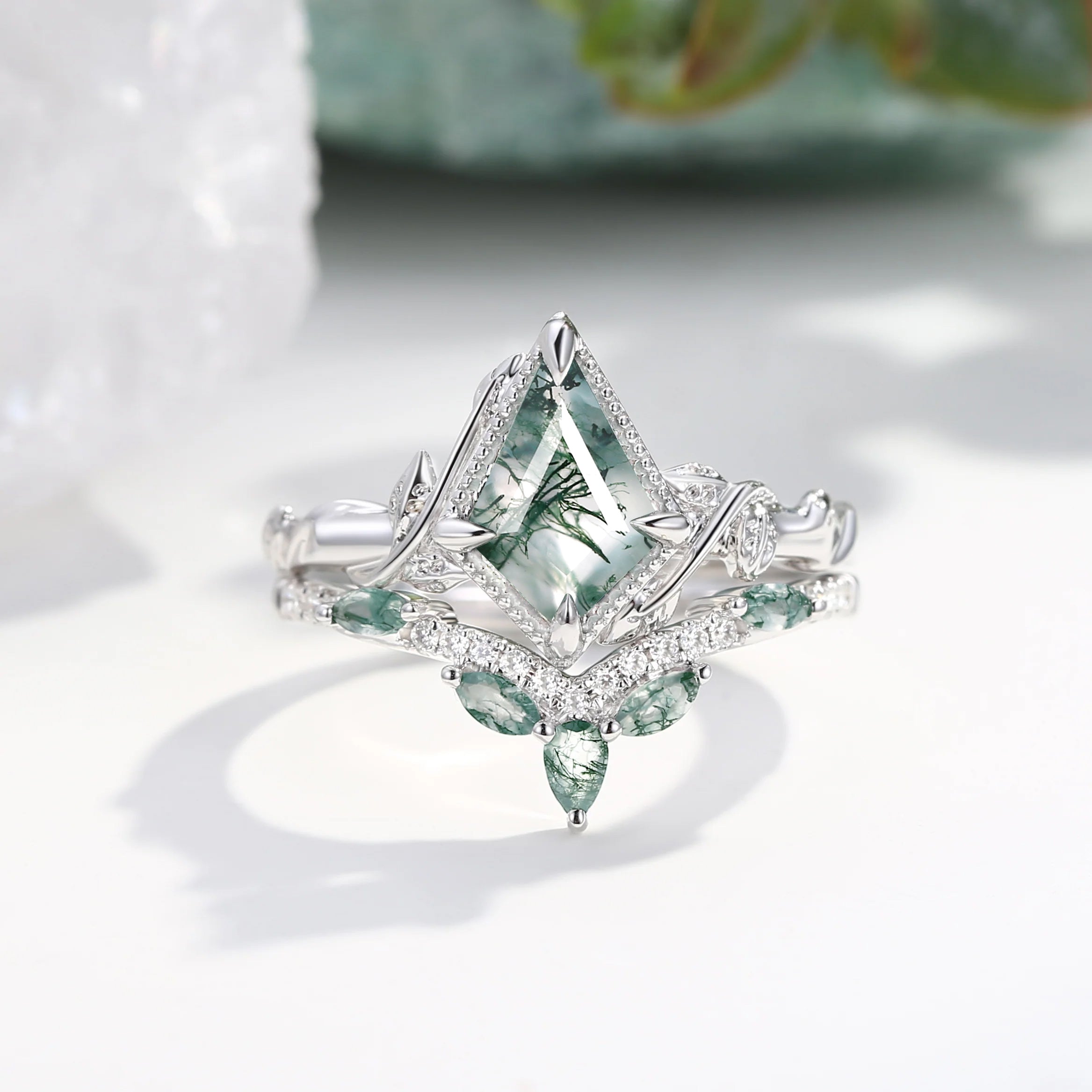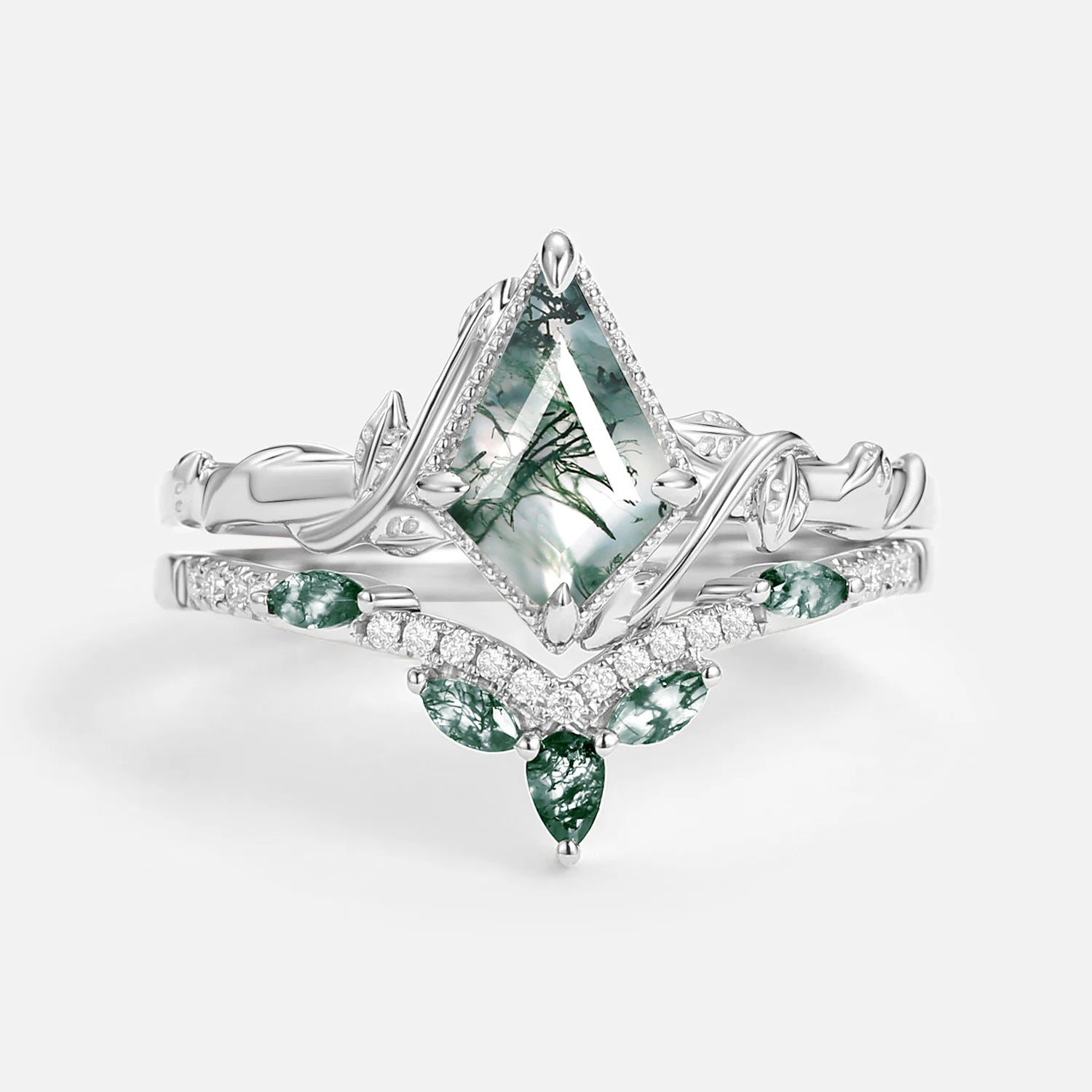 Kite Cut Nature Moss Agate Leafy Engagement Ring Set 2pcs - Lark