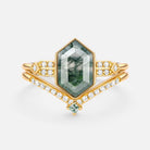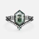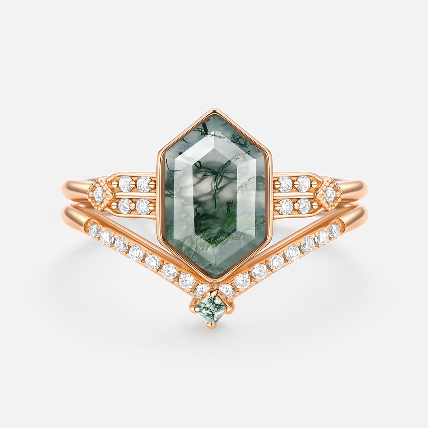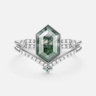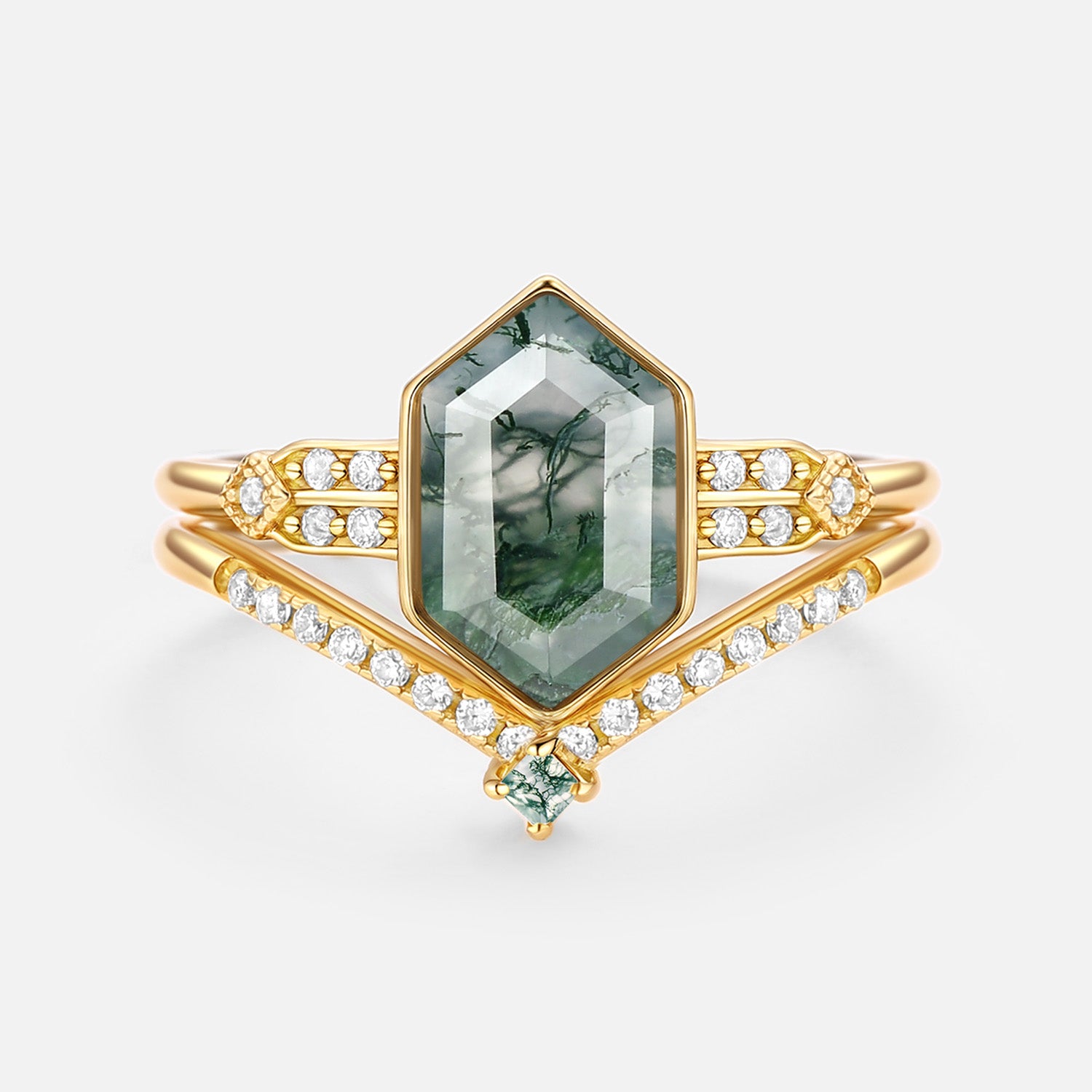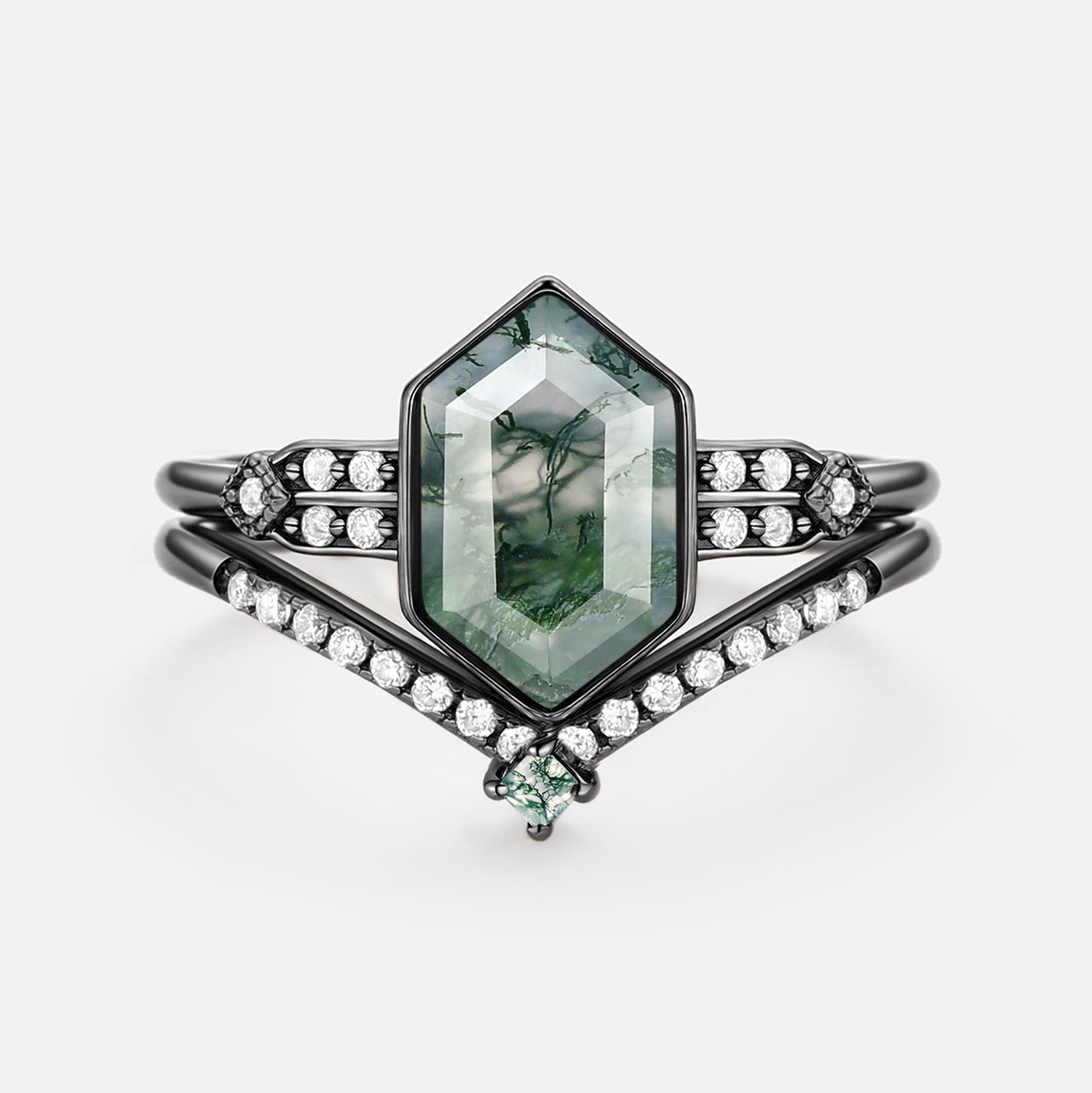 Long Hexagon Moss Agate Minimalist Bridal Ring Set 2pcs - Nocturne