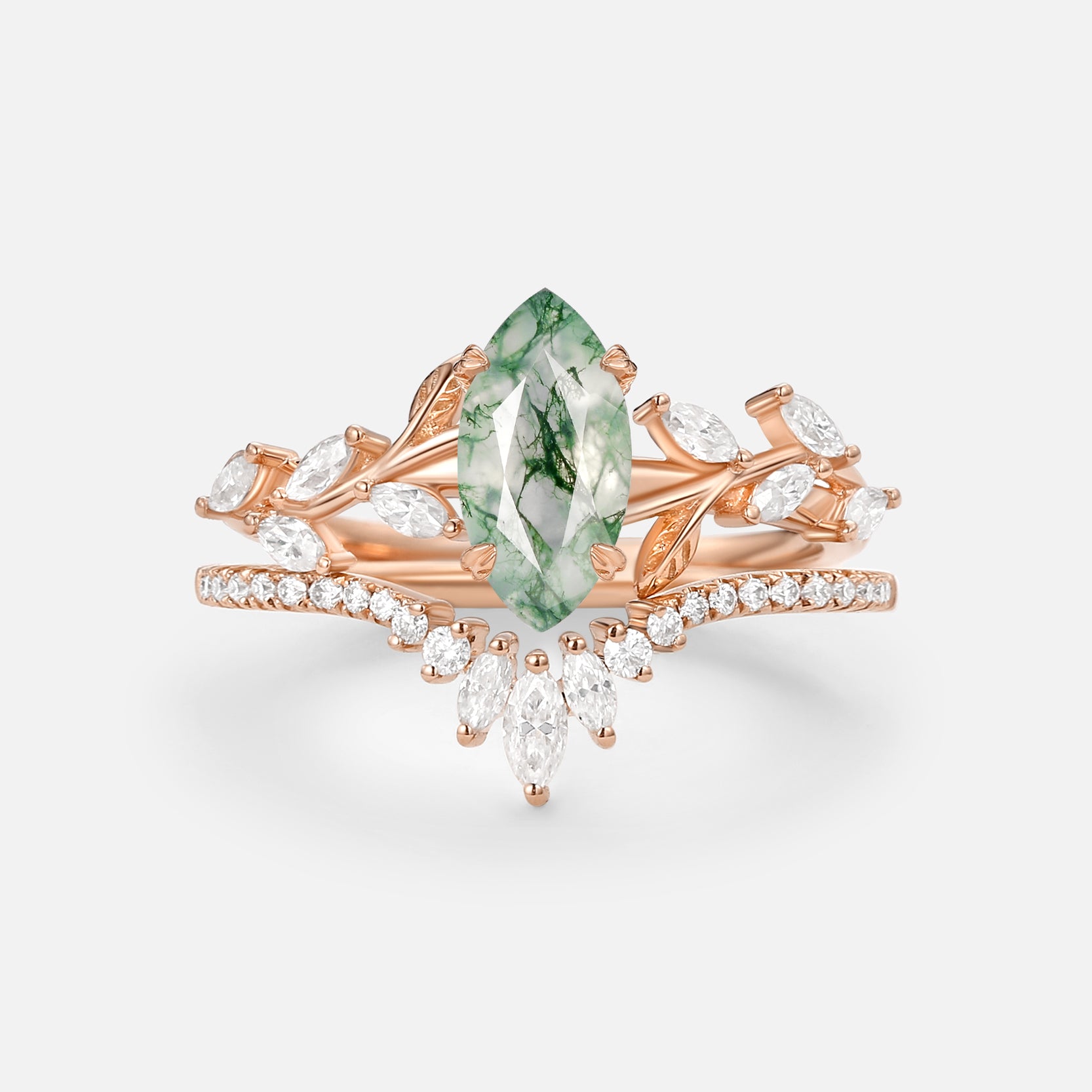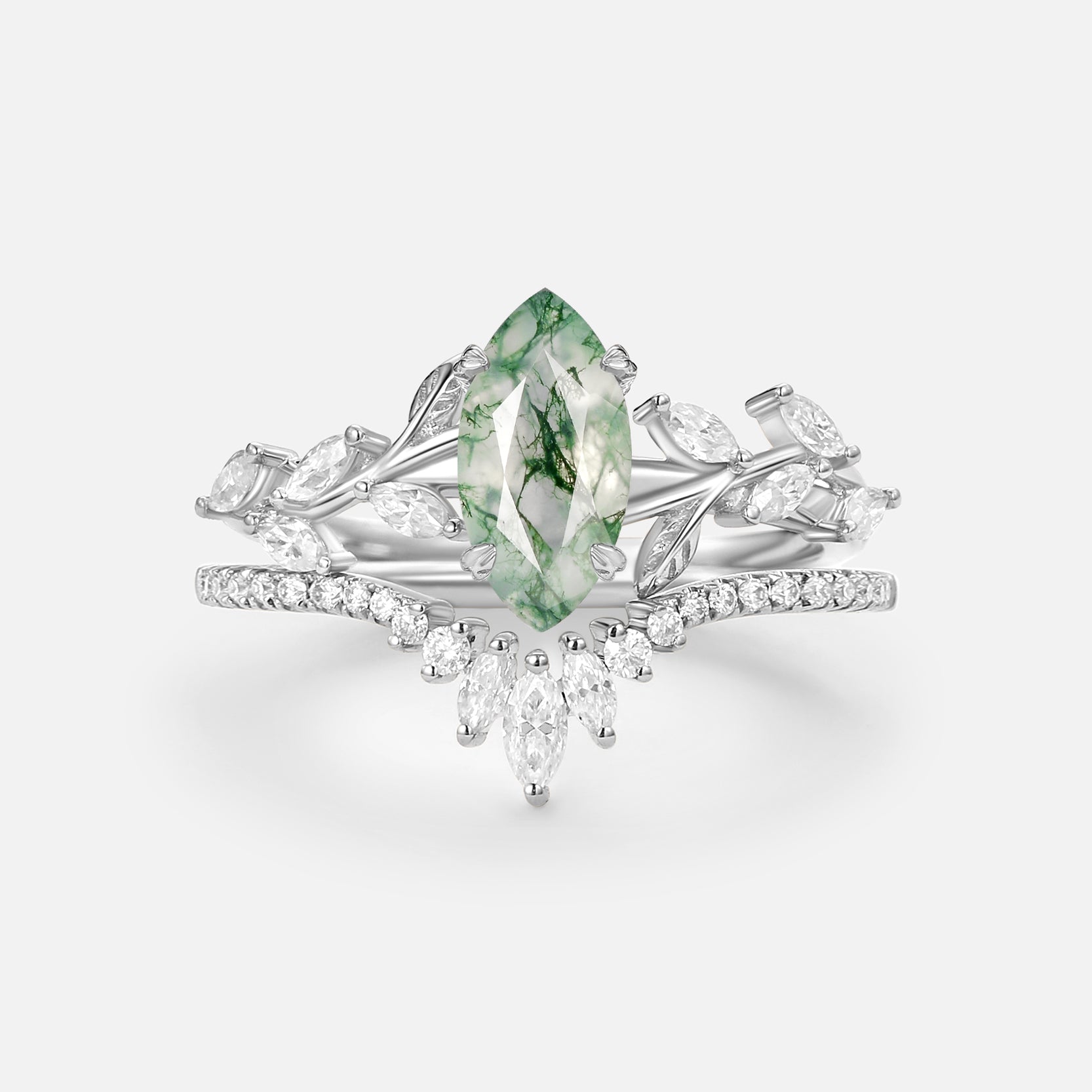 Fall for forever with our Dart Marquise Cut Moss Agate Leafy Engagement Ring Set—a 2-piece pair where romance meets artistry.