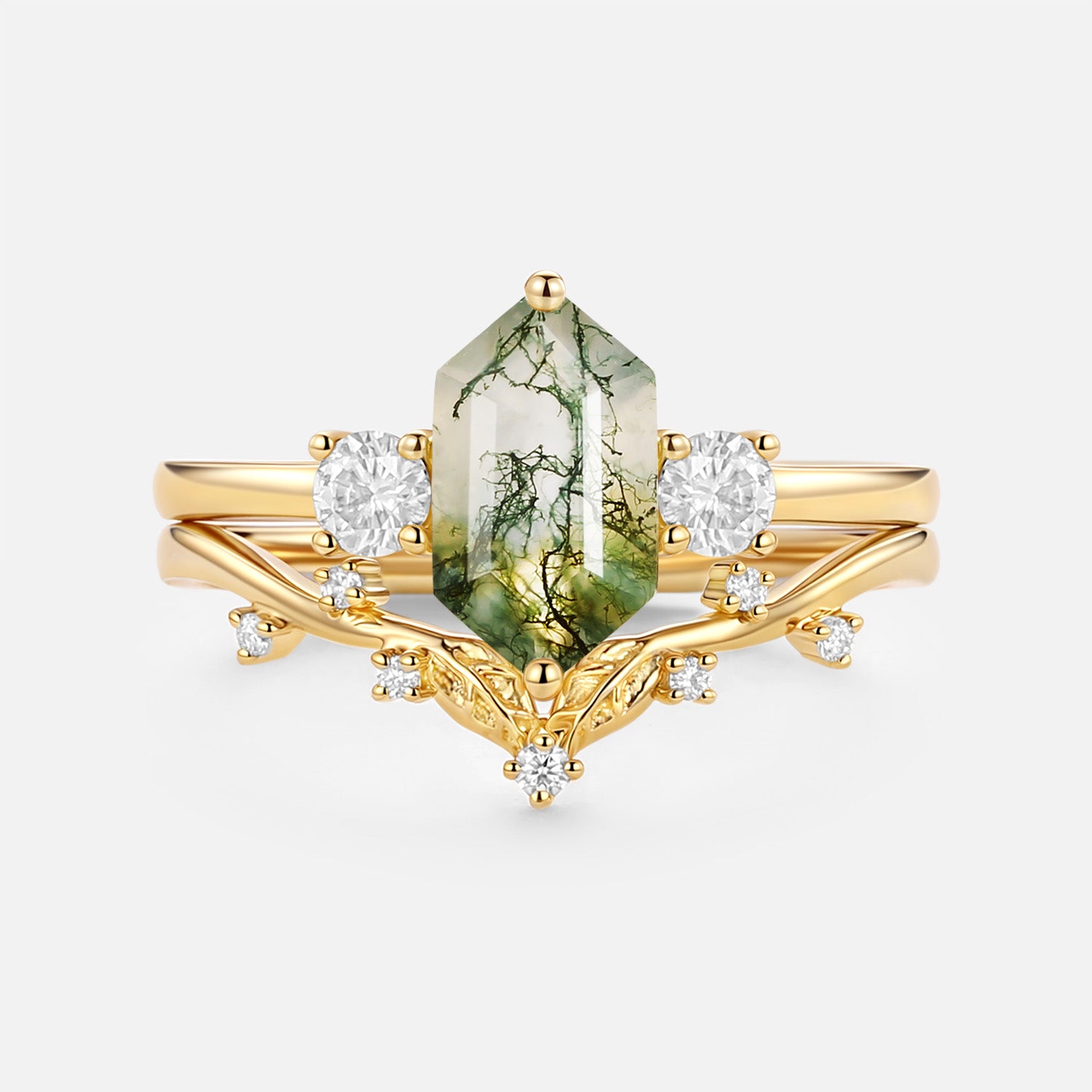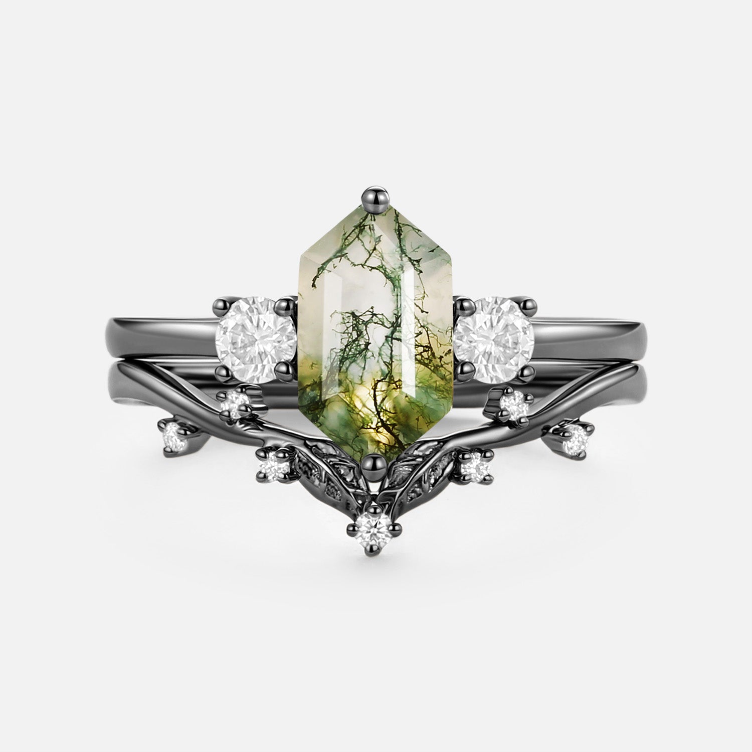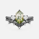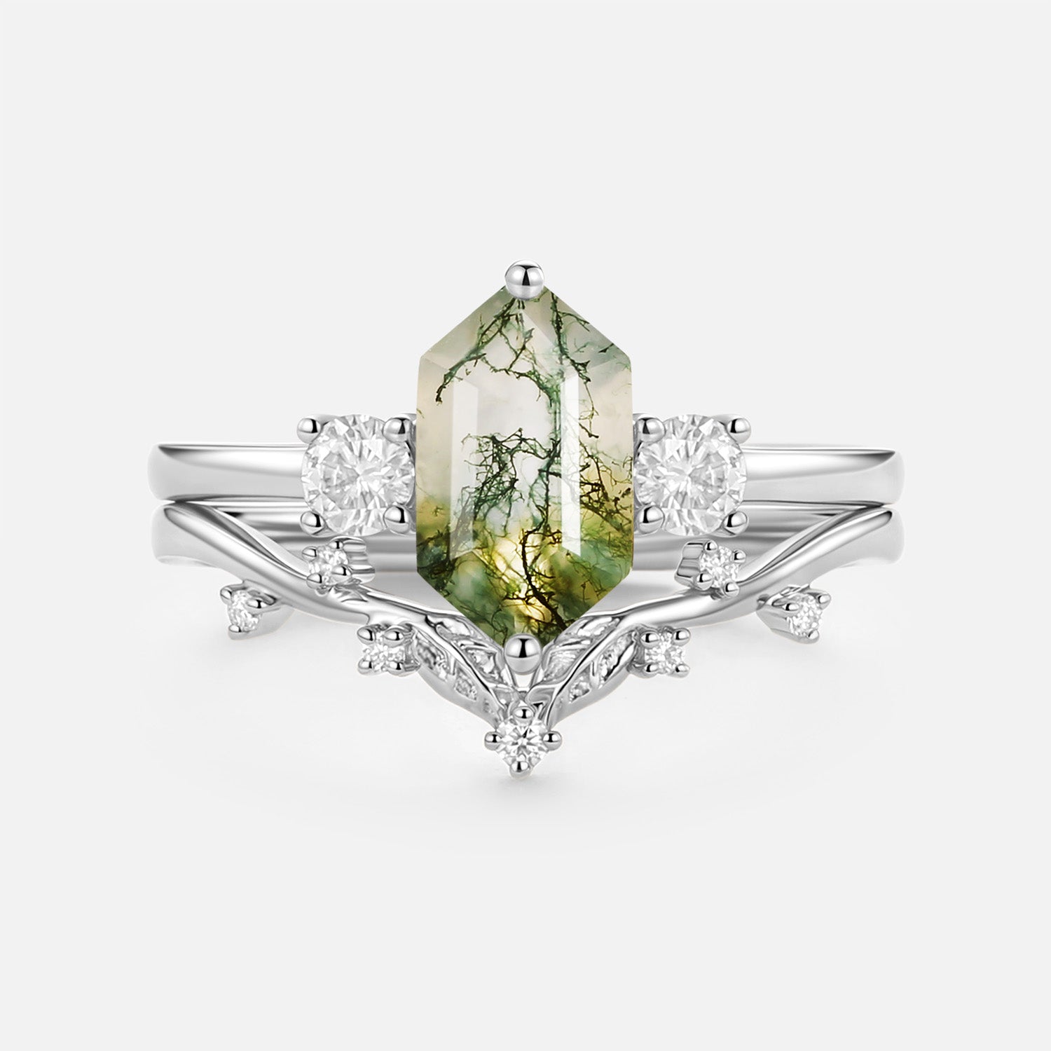 Moss Agate Elongated Hexagon Engagement Ring Set 2pcs - Sunny