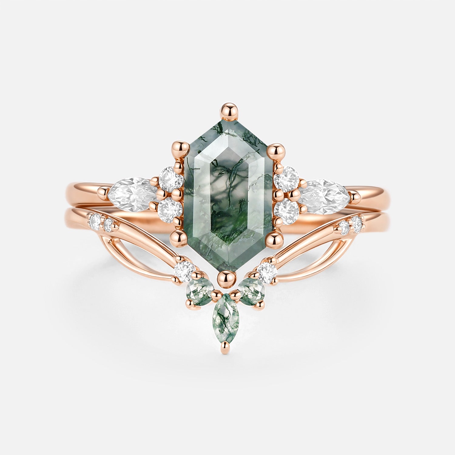 Moss Agate Long Hexagon Vintage Vine Engagement Ring Set 2pcs - Nyssa