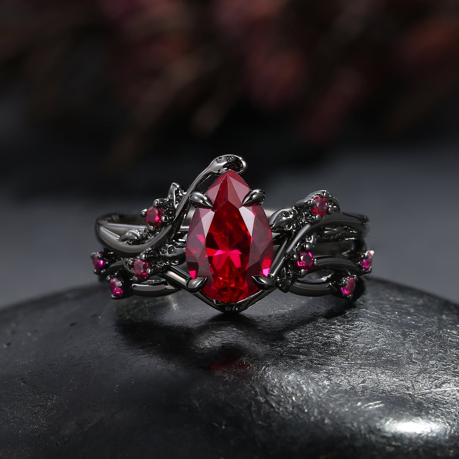 Nature Inspired - Pear Shaped Lab Ruby Leafy Ring Set 2pcs - Mossy