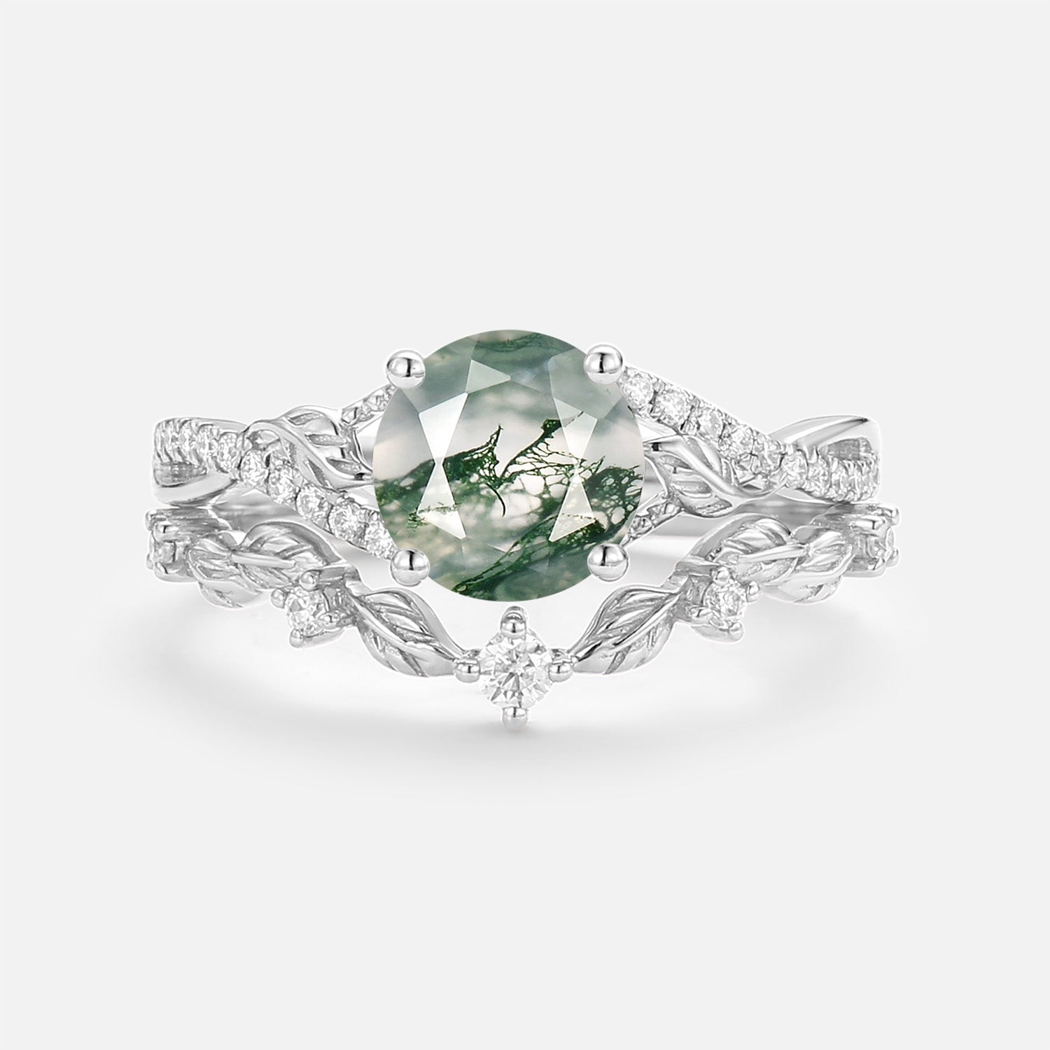 Nature Inspired-Round Moss Agate Leafy Engagement Ring Set 2pcs - Syrin