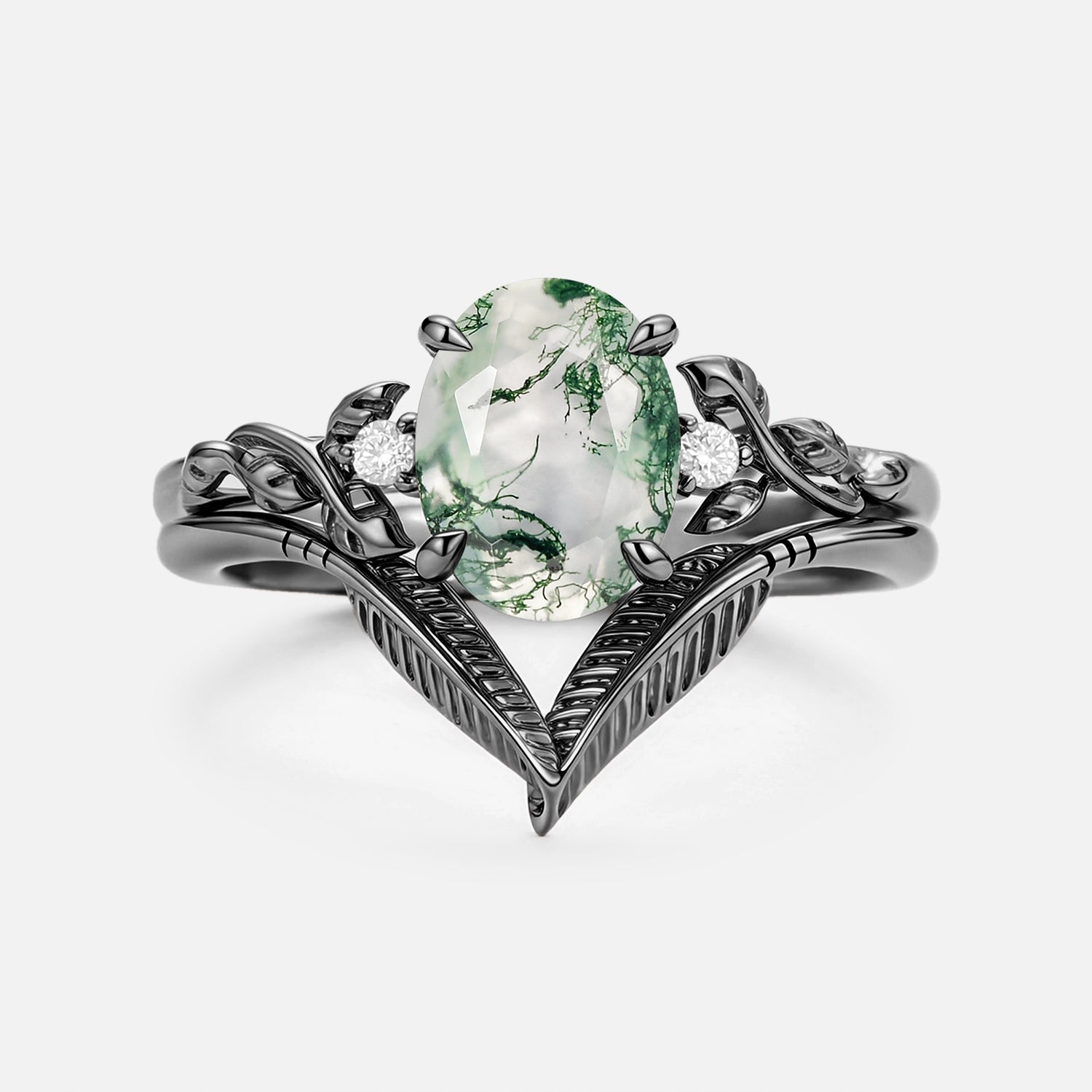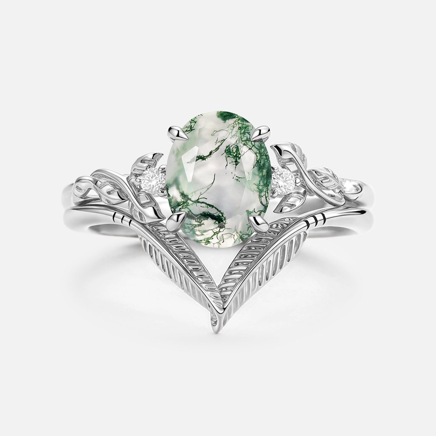 Felicegals Oval Moss Agate White Gold Leafy Ring Set 2pcs Moss Agate Engagement Ring Stacking Wedding Ring Anniversary Promise Women Gift