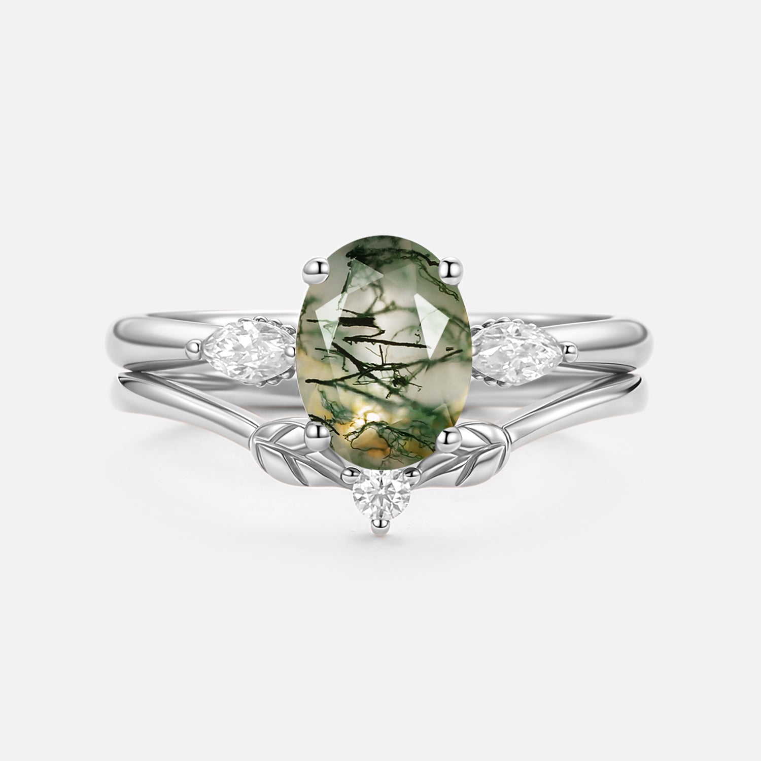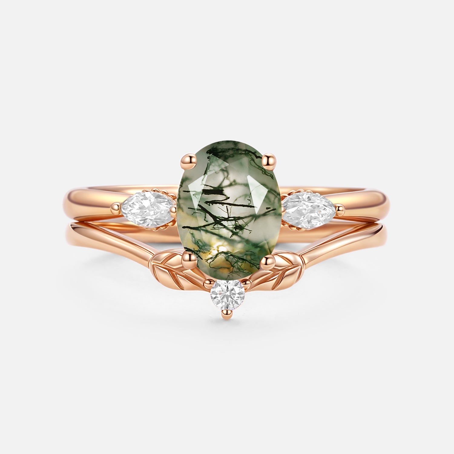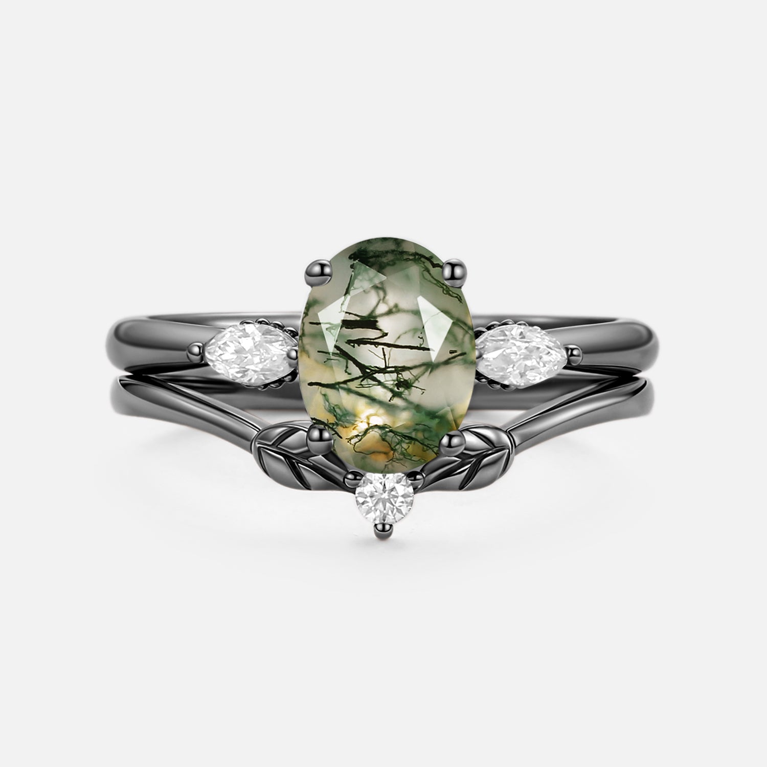Oval Cut Moss Agate Vine Engagement Ring Set 2pcs - Bowie