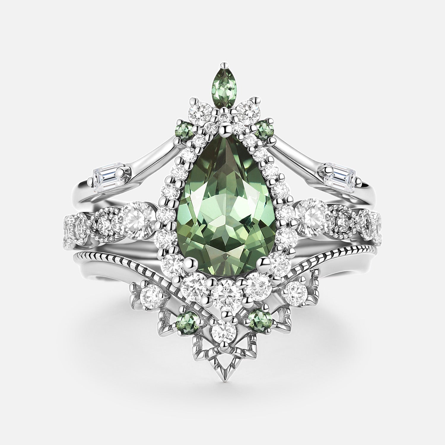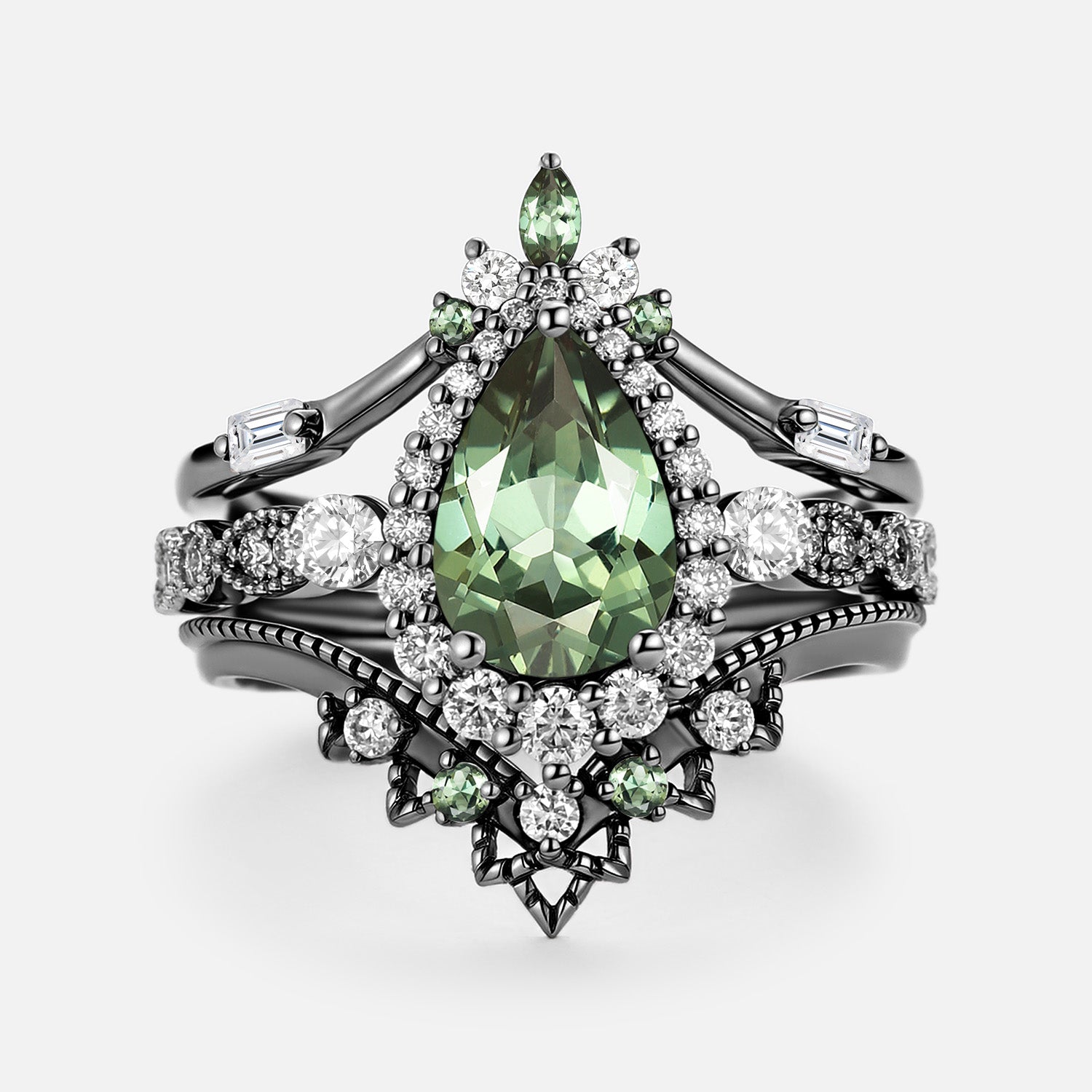 Pear Cut Lab Green Sapphire & Pearl Ring Sets 3pcs - Dew