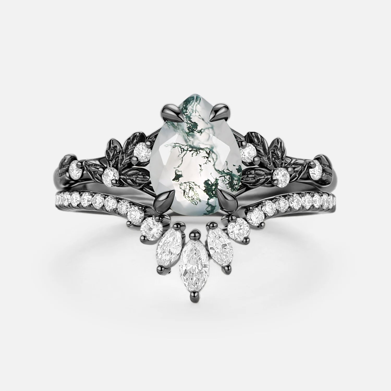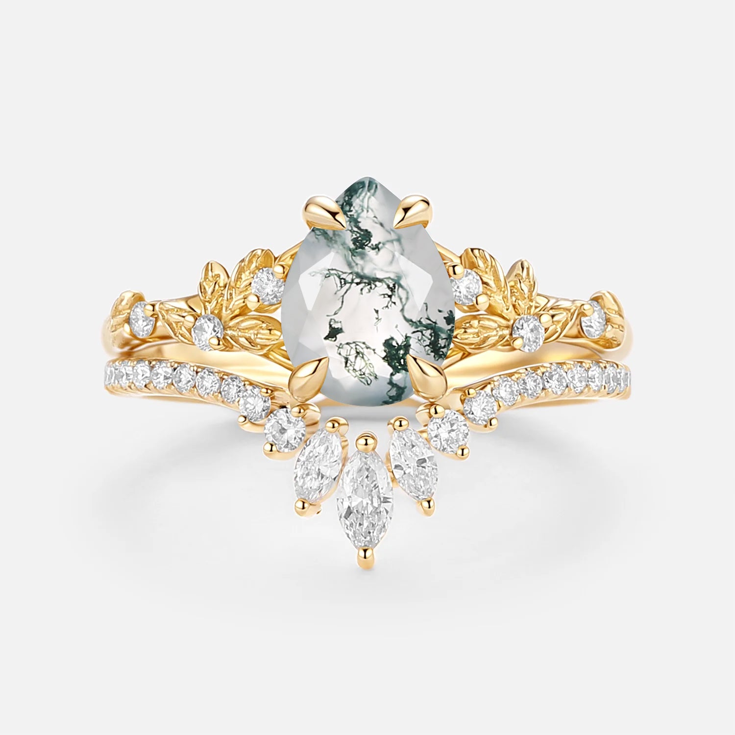 Pear Cut Leafy Moss Agate Engagement Ring Set 2pcs - Kestrel