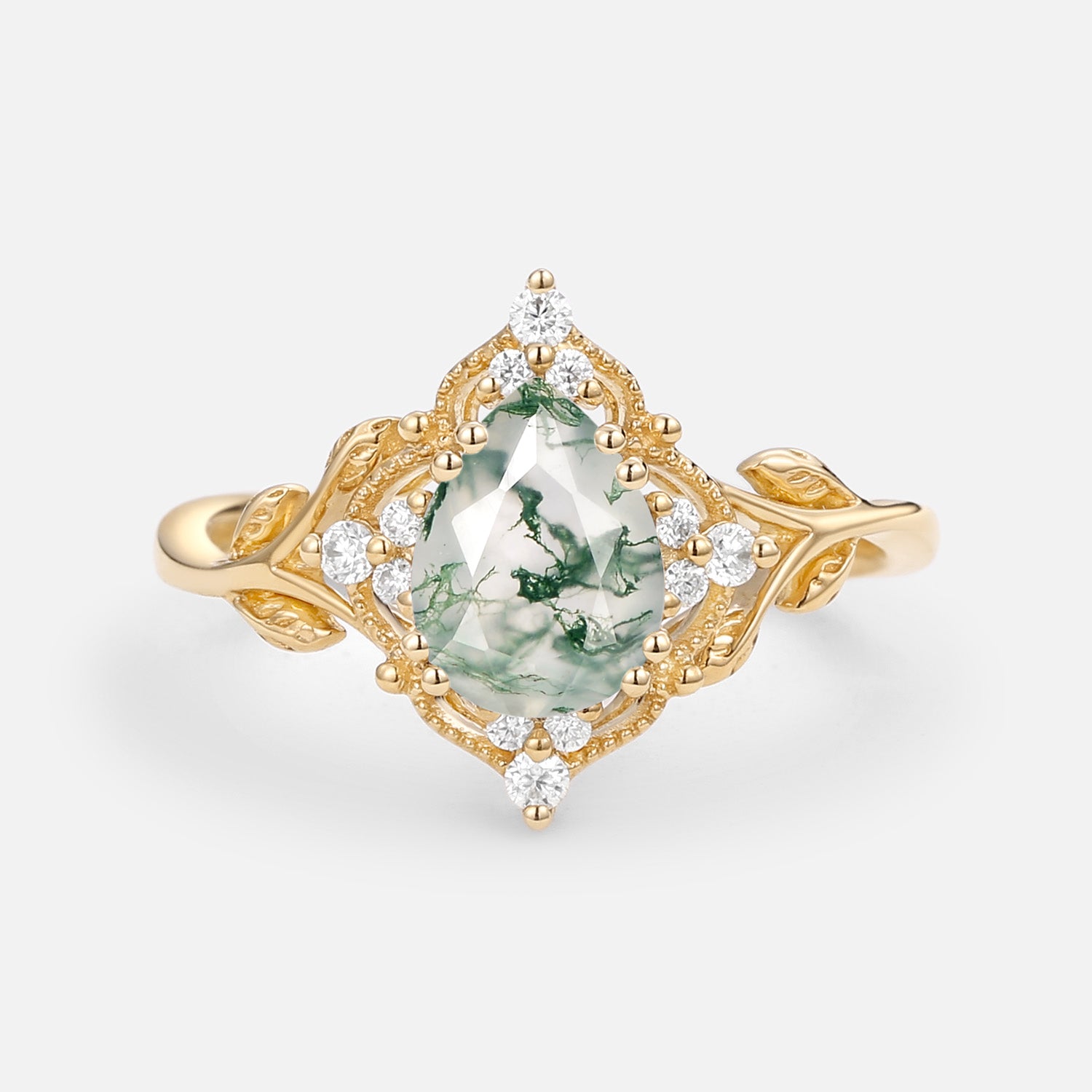 Pear Cut Moss Agate Leafy Vintage Engagement Ring