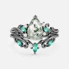 Pear Shaped Vintage Moss Agate Leafy Ring Set 2pcs - Pyrrhus