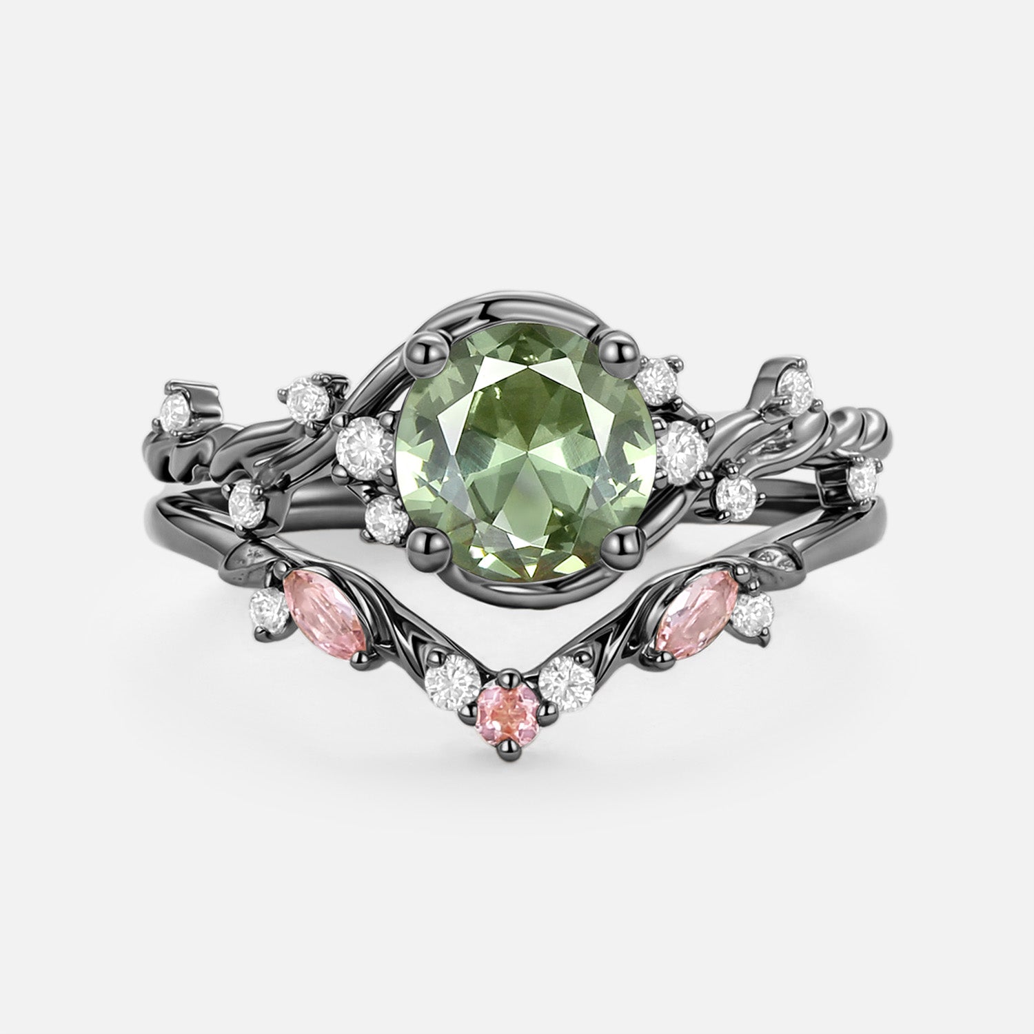 Round Cut Lab Green Sapphire Leafy Engagement Ring Set 2pcs - Verdi