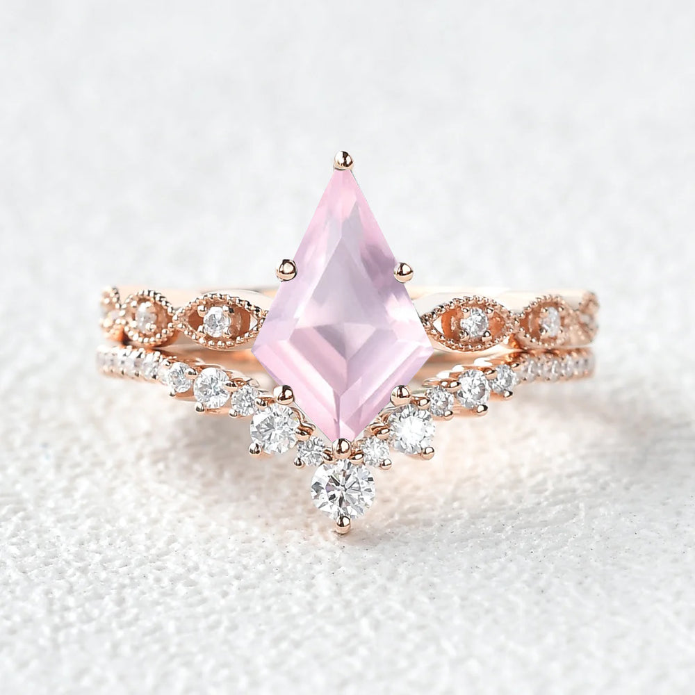 Vintage Rose Quartz Kite Cut Engagement Ring Set 2pcs - Winona