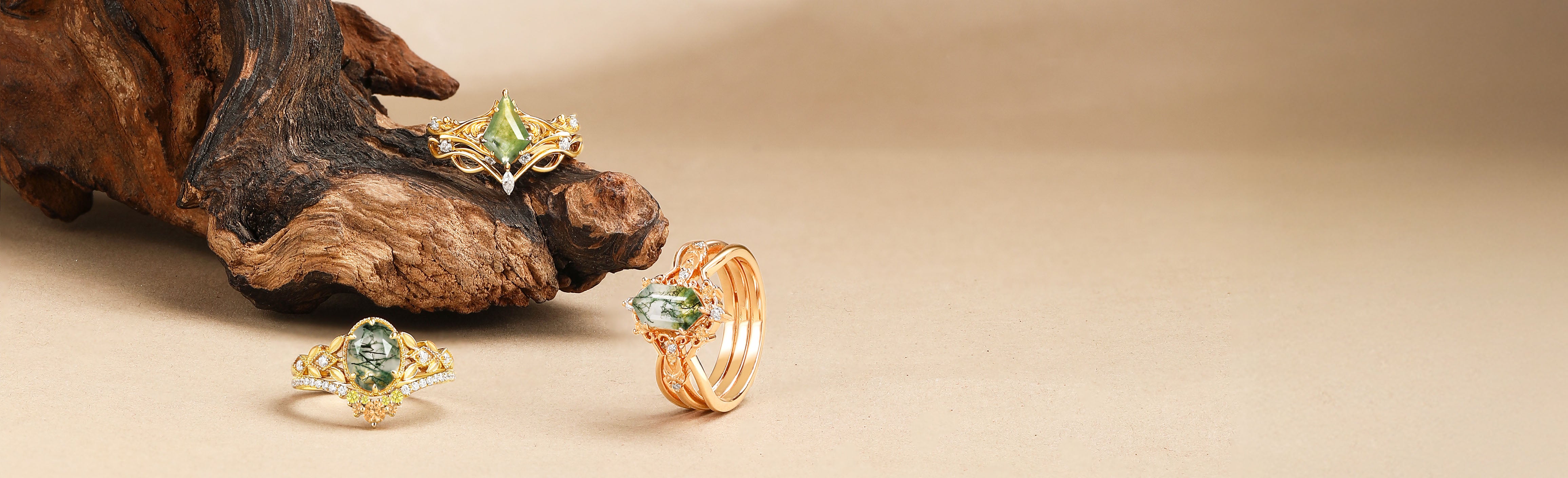 Inspired by golden forests, this collection glows with warm green moss agate, layered like sunlit leaves. The band’s graceful, textured design reflects the strength and calm of a season gathered in. Wearing it feels like carrying quiet wisdom—a reminder of journeys completed and depth earned. It speaks of harvests within, and the gentle pride of a heart that has learned to embrace every chapter.