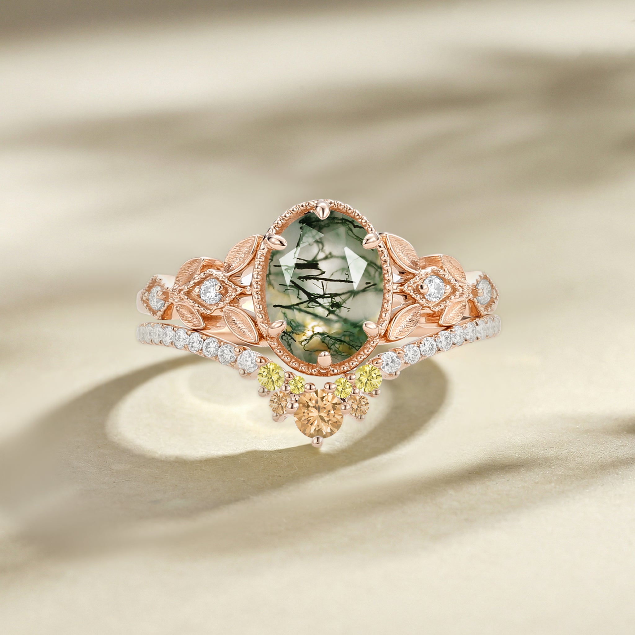 Fiancée went crazy for this Selene set—best purchase ever! The oval cut flatters her fingers so well, the moss agate’s texture is warm and organic, and the gold feels luxurious without being flashy. She’s obsessed with the leaf engravings—says they add just enough charm. Wears it 24/7, and it’s held up great to her busy schedule (she’s a teacher, so lots of hand-washing!). We wanted something non-traditional but timeless, and this hits the sweet spot. 10/10 recommend.