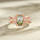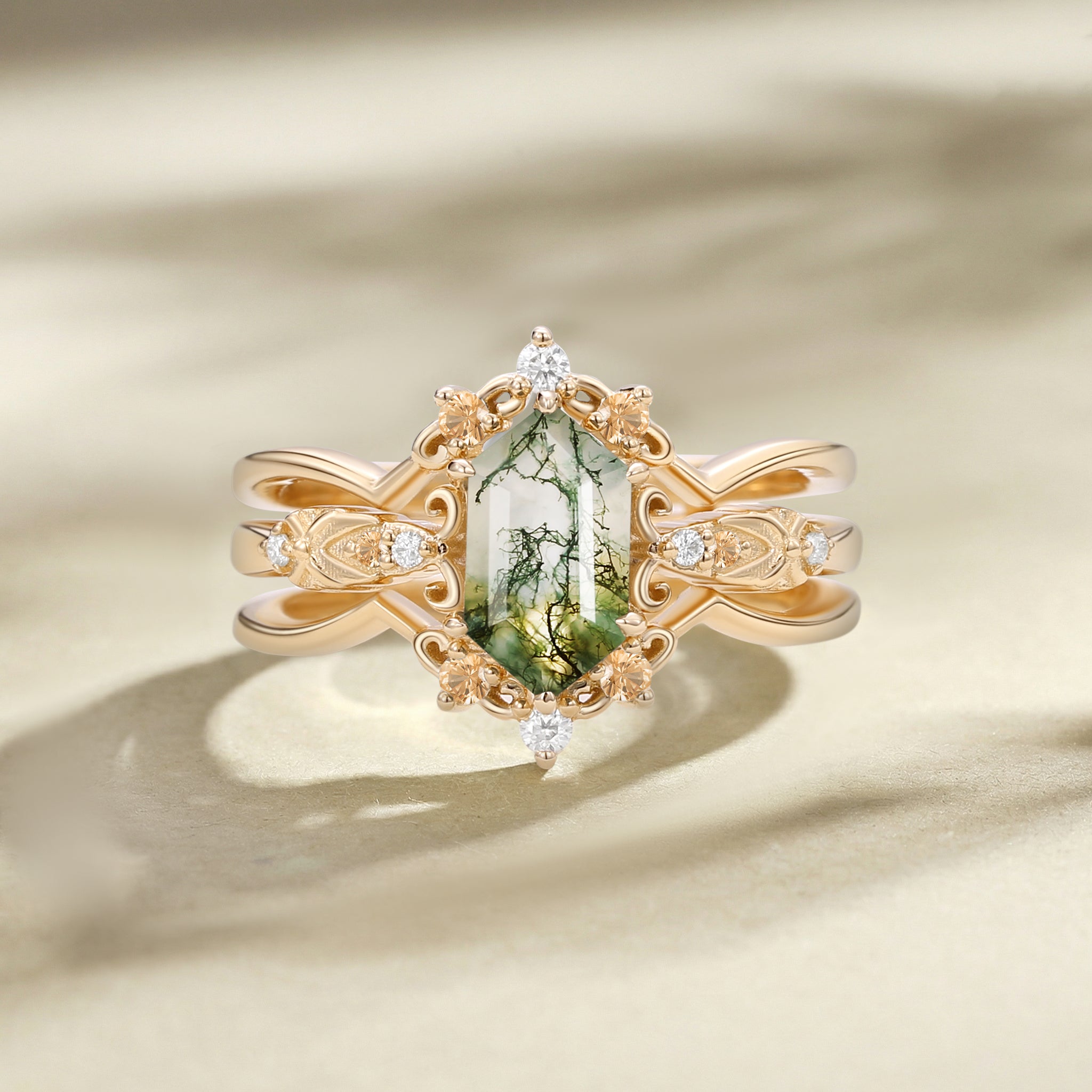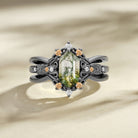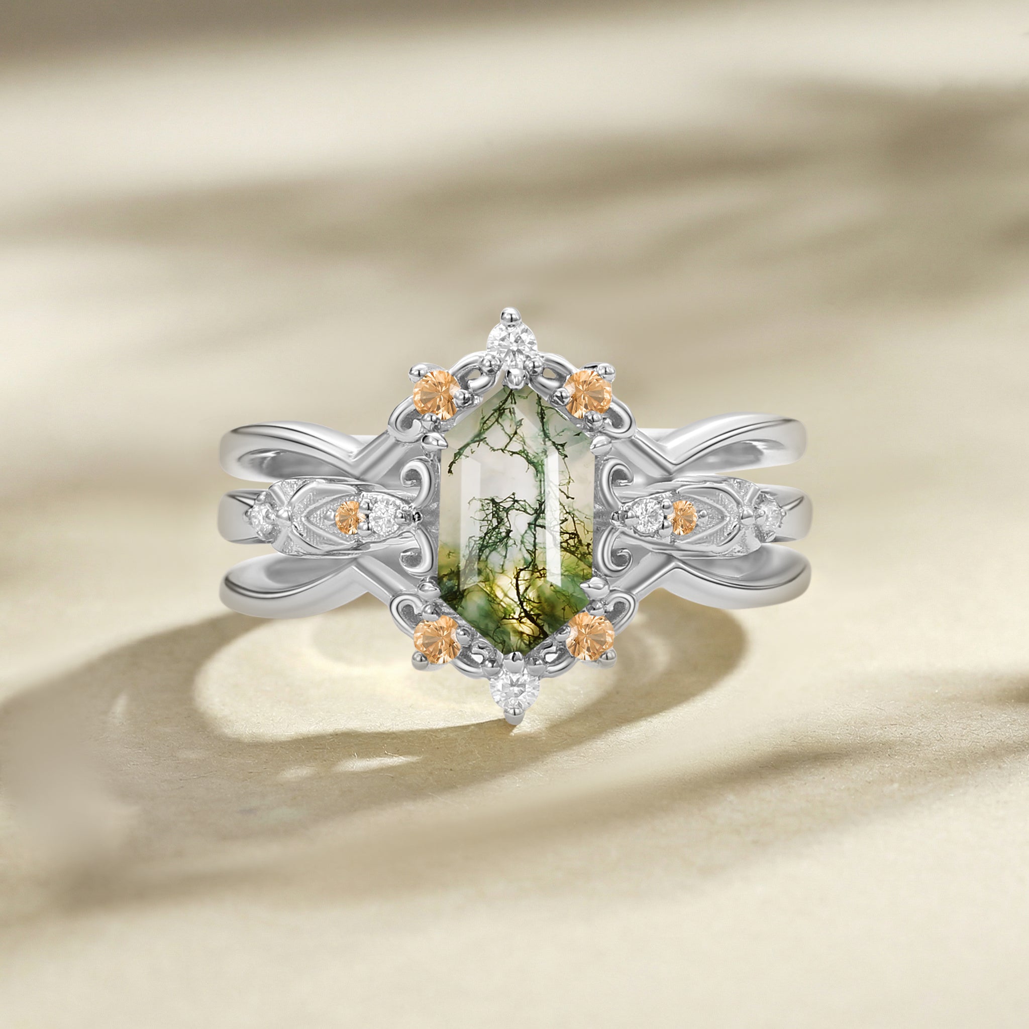 Vintage Long Hexagon Moss Agate Engagement Ring Set 2pcs - Reese