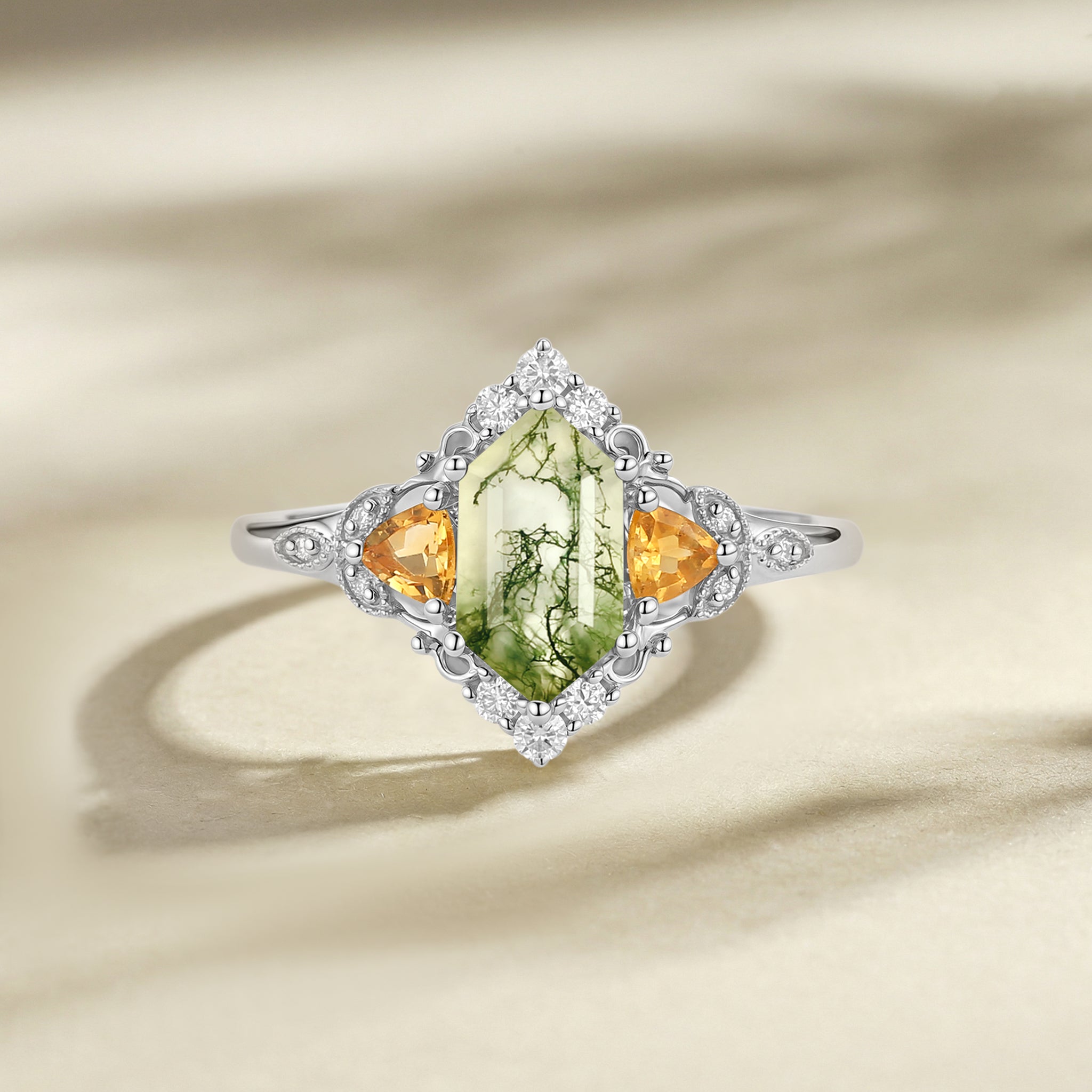 Vintage Moss Agate Long Elongated Hexagon Engagement Ring - Herald
