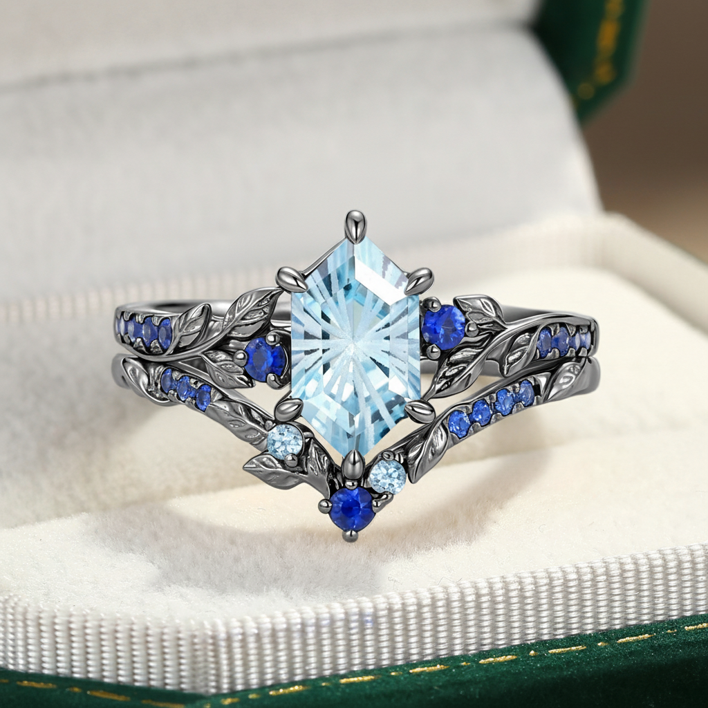 Elongated Hexagon Fireworks Cut Aquamarine Engagement Ring Set 2pcs - Azure