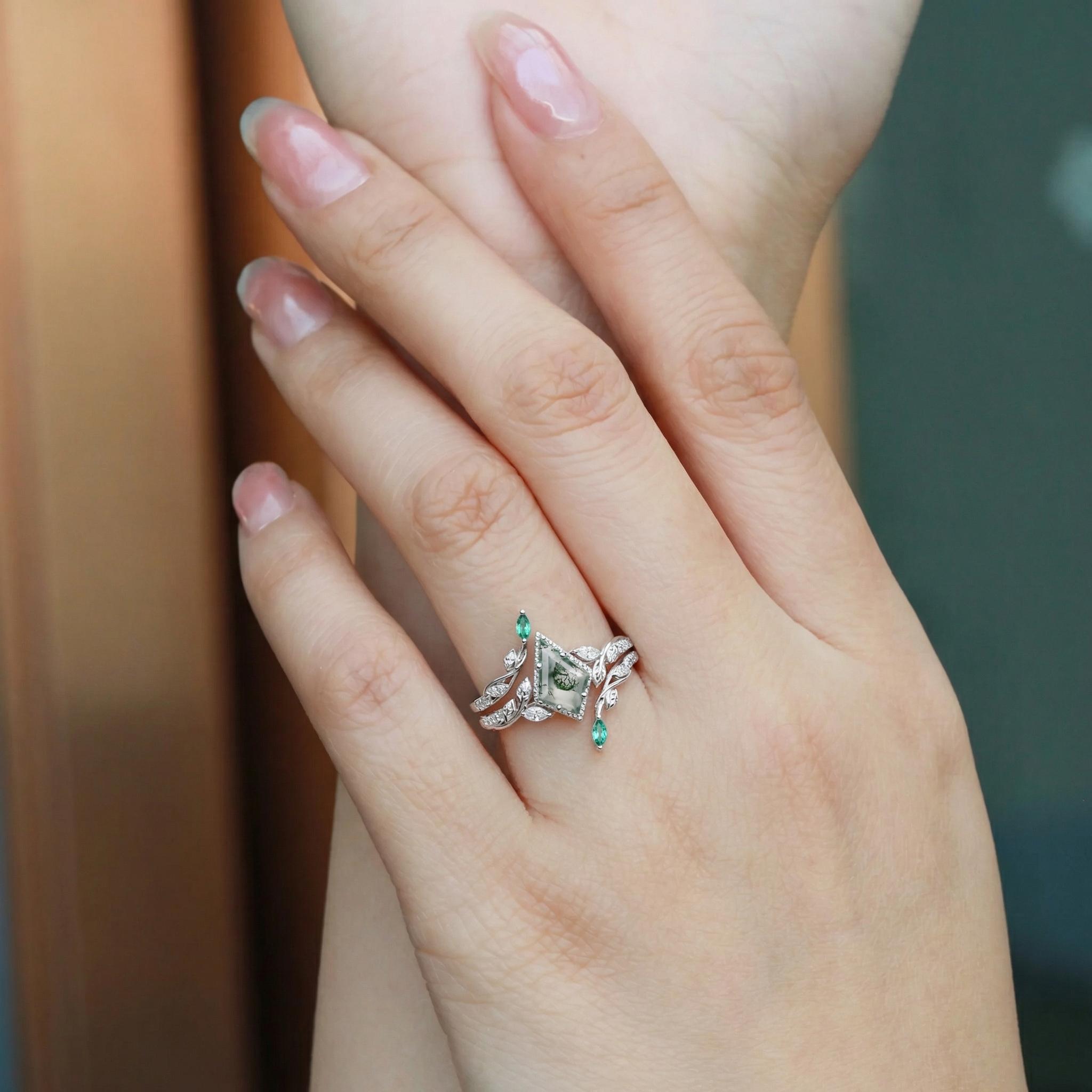 Leafy Vintage Kite Cut Moss Agate Cage Engagement Ring Set 2pcs - Breeze