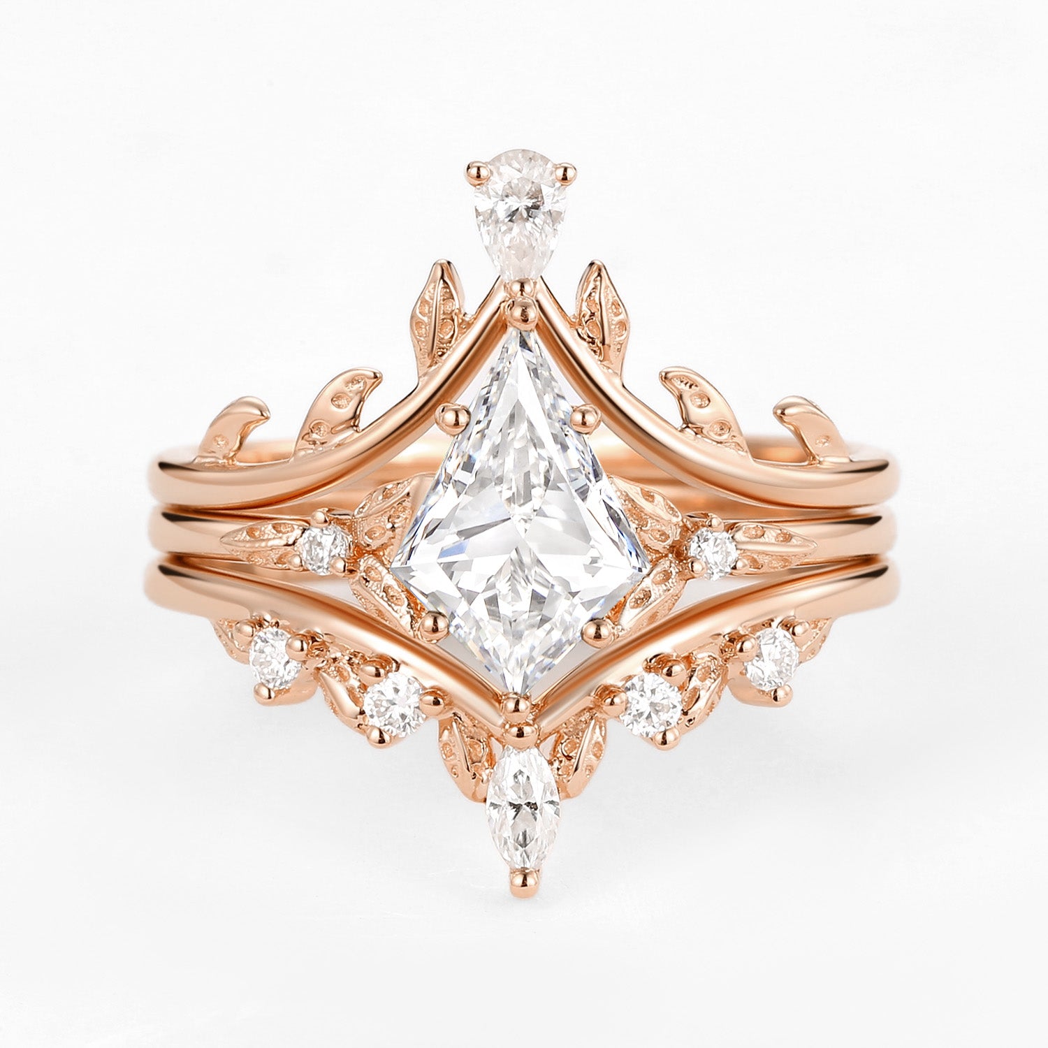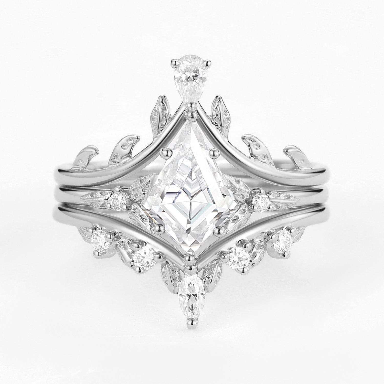 Kite Cut Moissanite Leafy Engagement Ring Set 3pcs