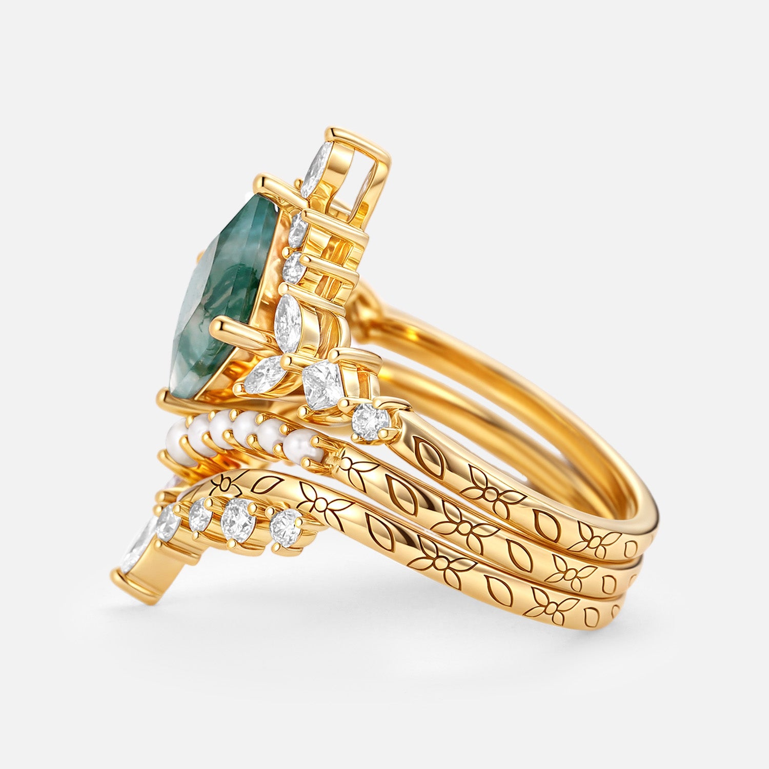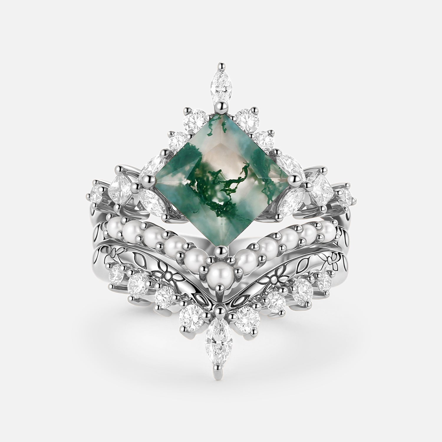 Moss Agate Engraved Princess Cut Cluster Engagement Ring Set 3pcs - Agnes