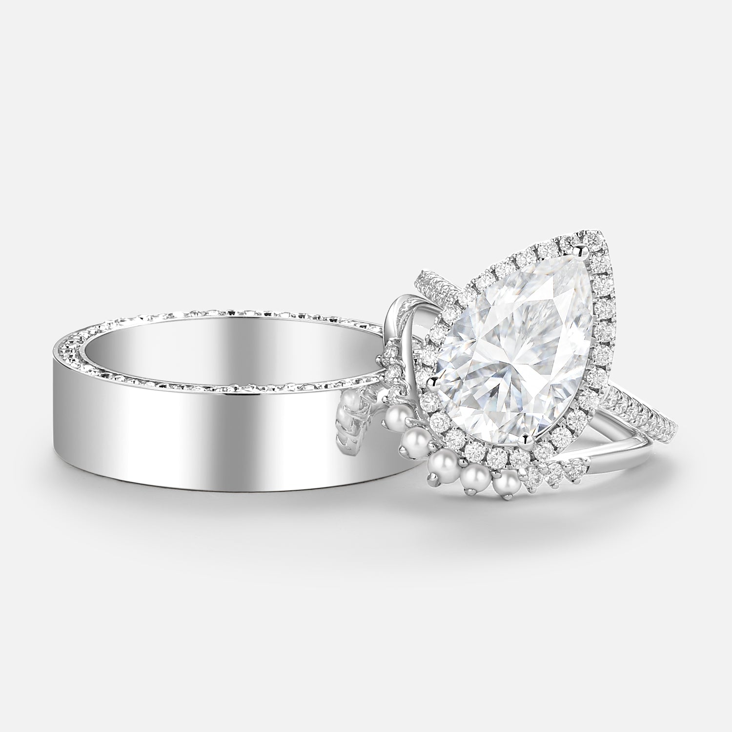 Pear Moissanite & Pearl Classic Halo Couple Ring Set 3pcs