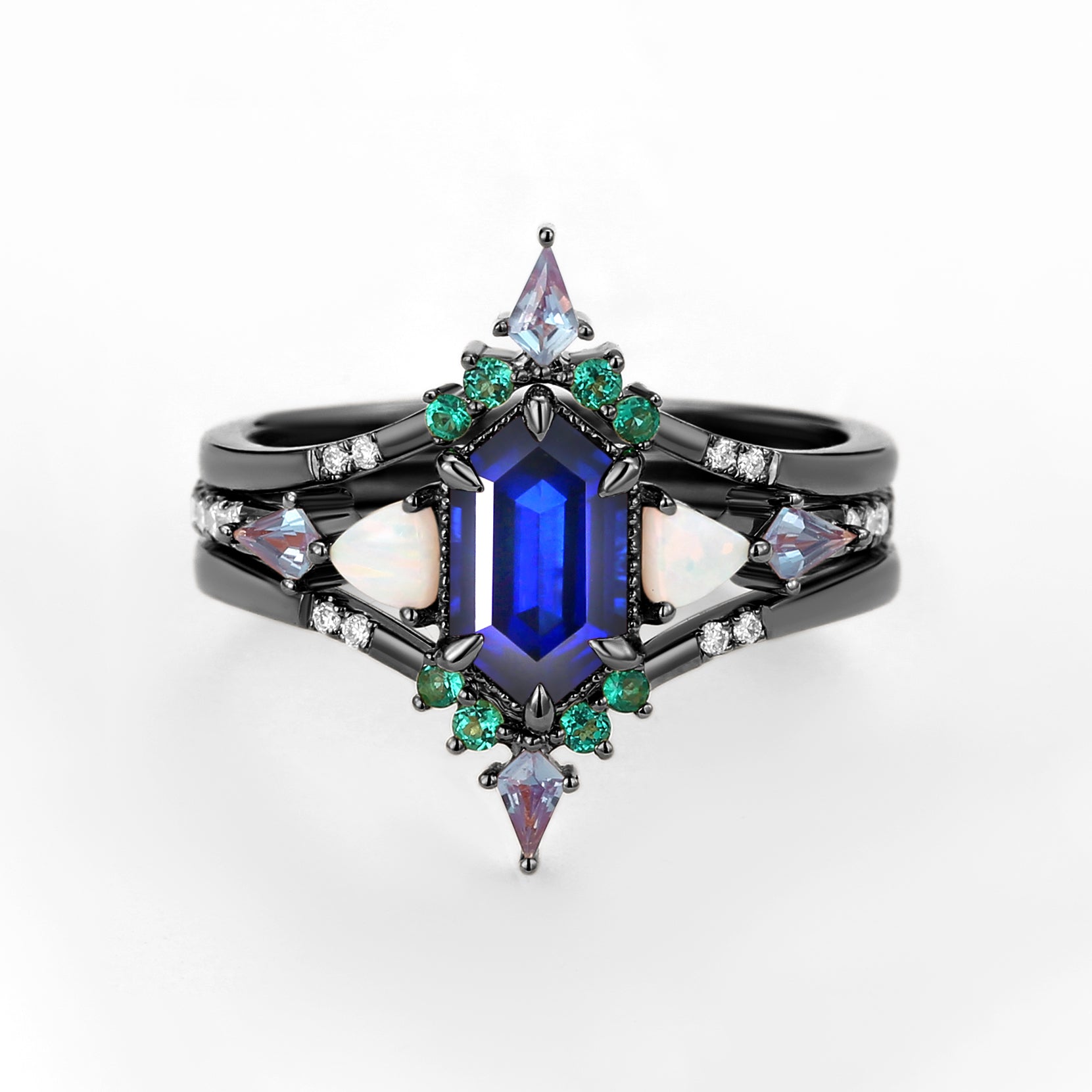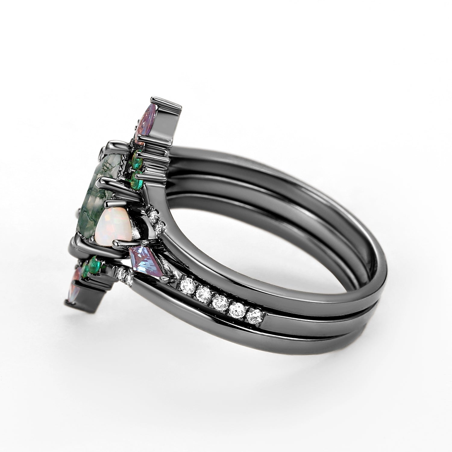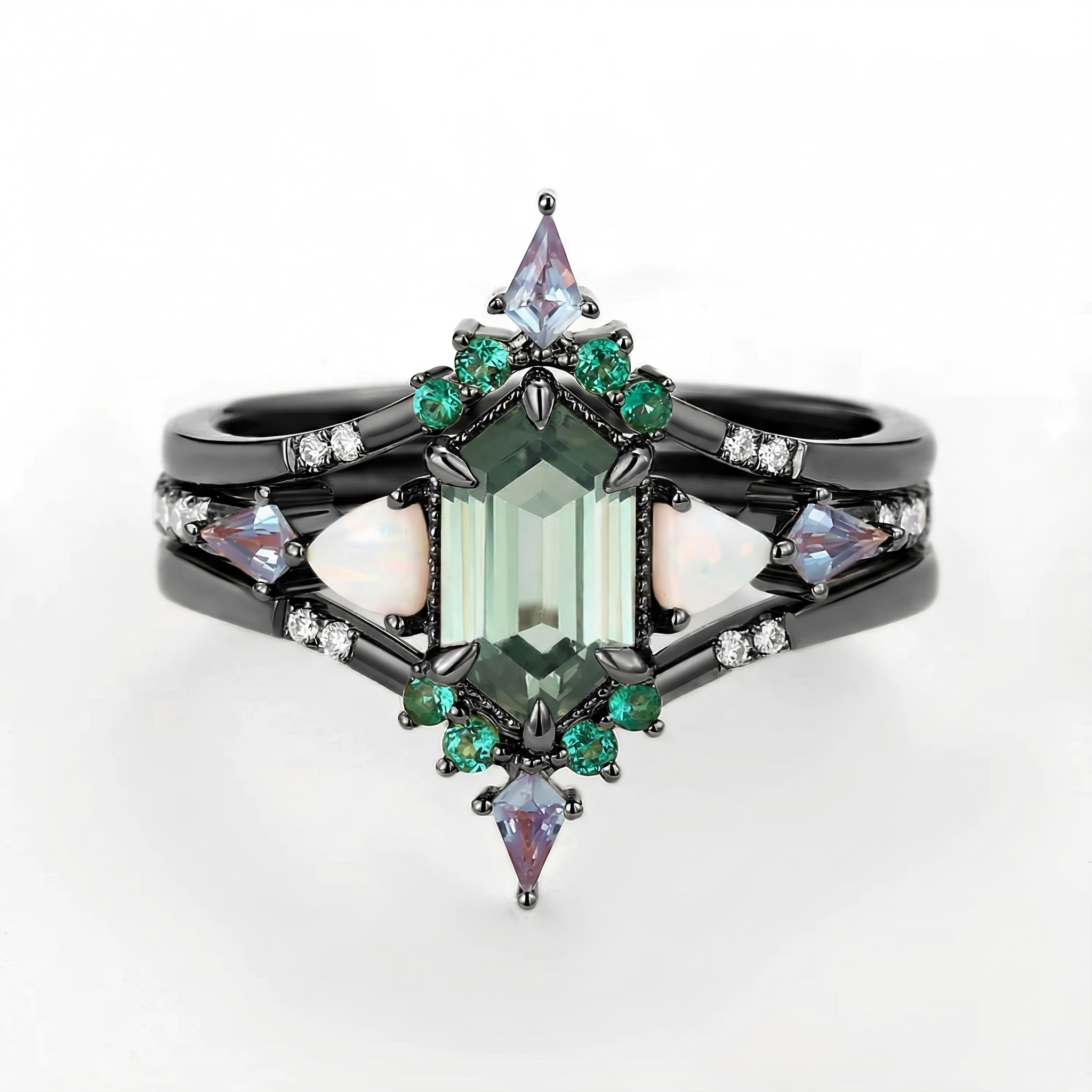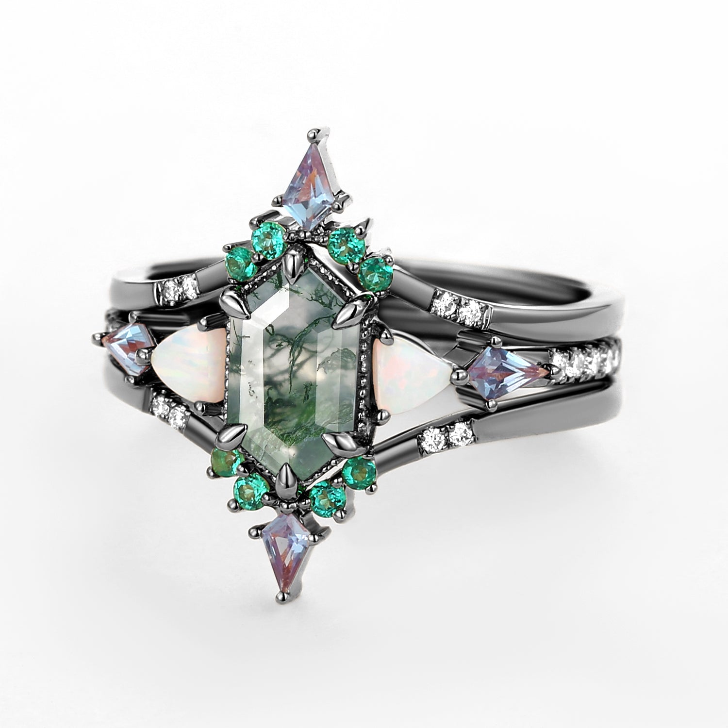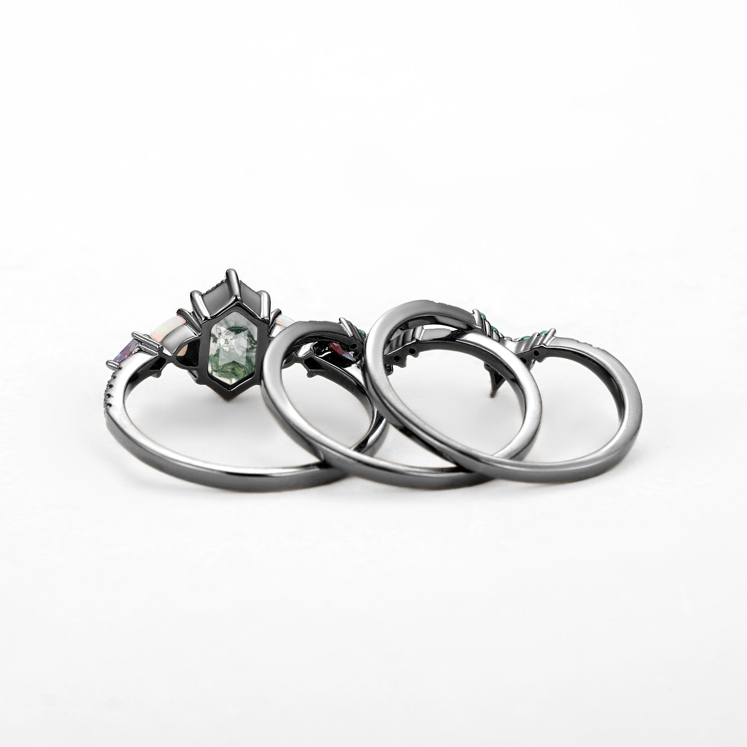 Black Gold Long Hexagon Moss Agate & Opal & Alexandrite & Emerald Ring Set 3pcs - Max