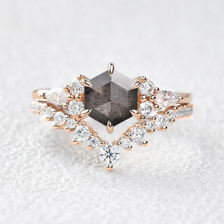 Hexagon Salt and Pepper Diamonds Cluster Engagement Ring Set 2pcs Bridal Ring Set Anniversary Gift