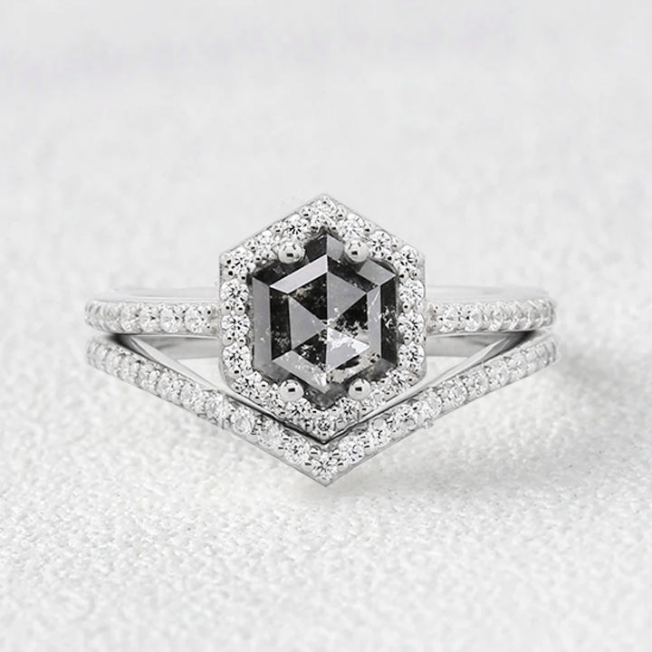 Hexagon Salt and Pepper Diamonds Stacking Engagement Ring Set 2pcs