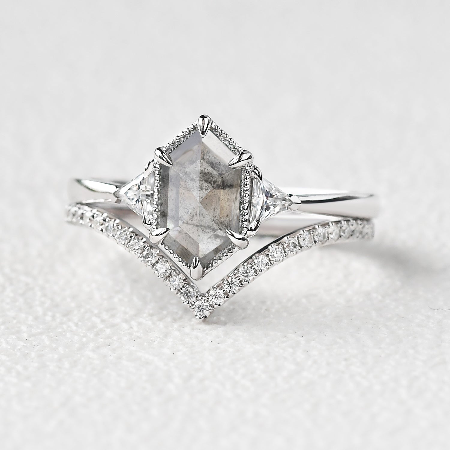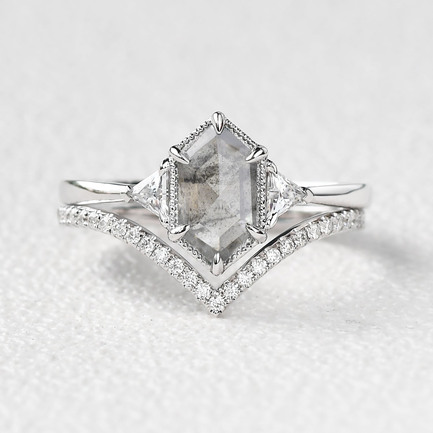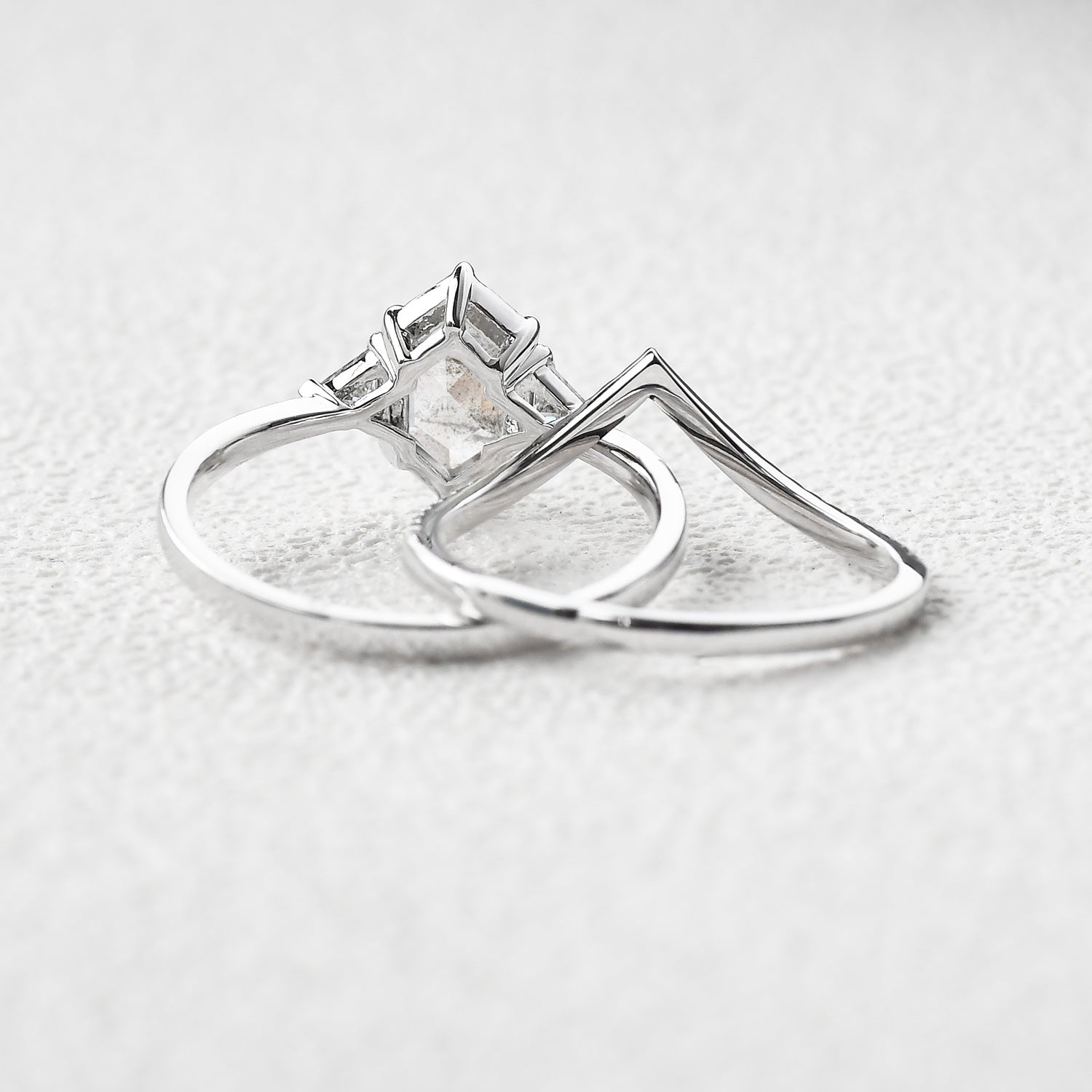 Hexagon Salt and Pepper Diamonds Three Stone Ring Set 2pcs