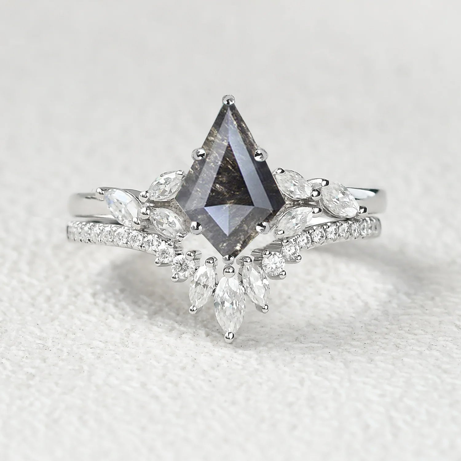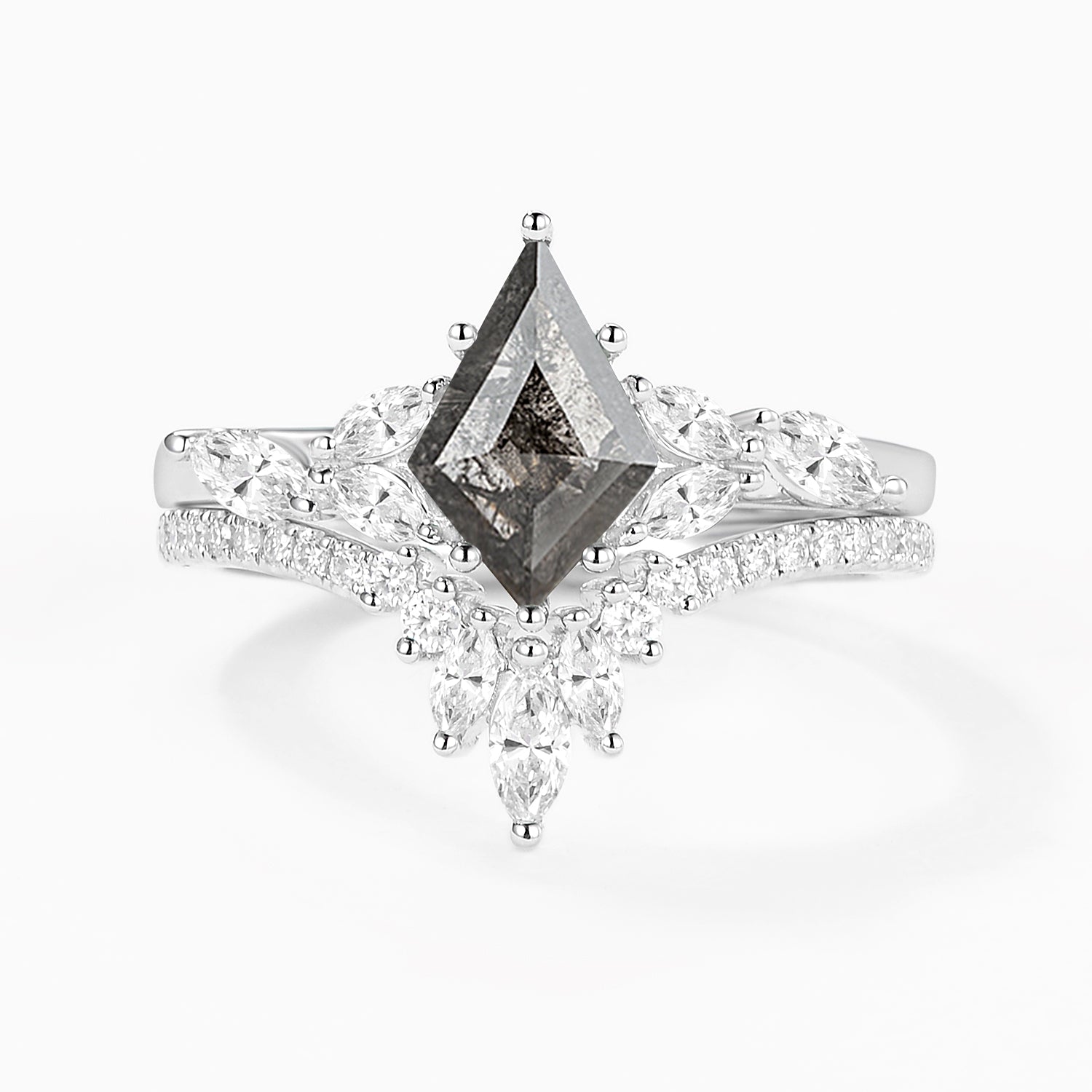 Kite Cut Salt and Pepper Diamonds Cluster Engagement Ring Set 2pcs